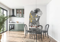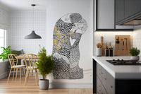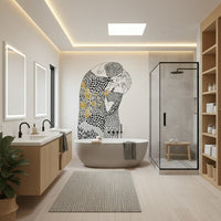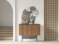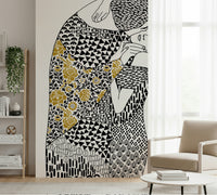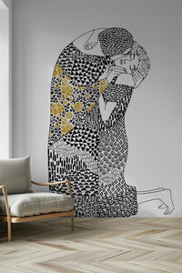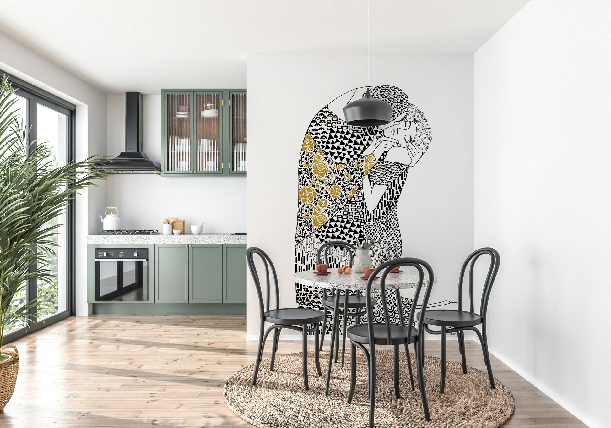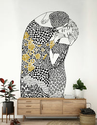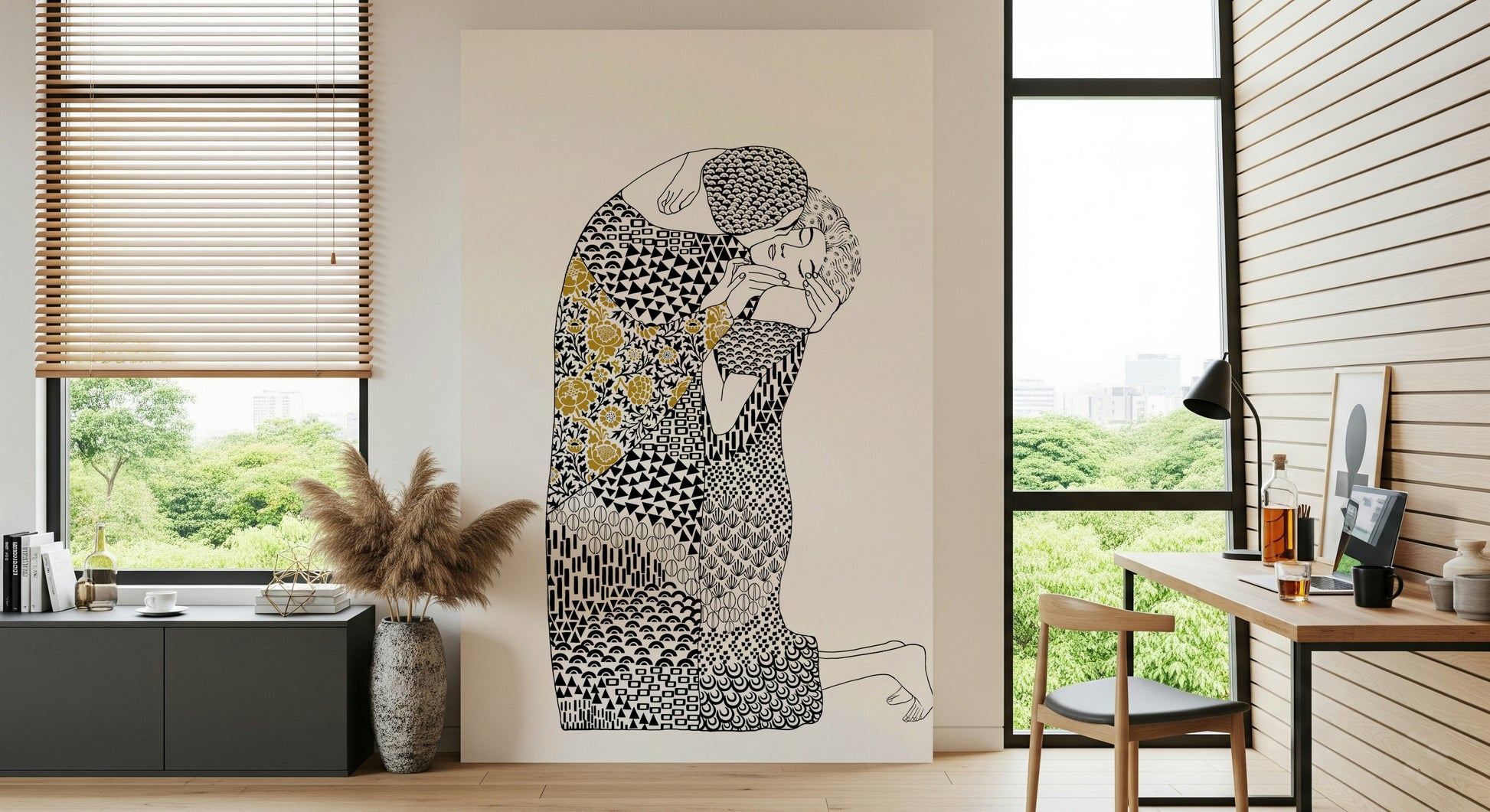 Immerse yourself in the tender embrace of "The Kiss," a captivating wall décor that echoes timeless romance. This artwork portrays a couple locked in an intimate moment, rendered in striking graphic patterns with a touch of golden floral elegance. The intricate details invite you to explore the depth of connection. Feel the intensity and passion with every glance. The intertwining figures are enveloped in geometric designs, while the flowing floral accent adds an organic counterpoint, symbolizing the bloom of love. "The Kiss" is more than just an image; it's an emotional narrative for any living space. Let it be a visual declaration of affection, breathing life and warmth into your home.