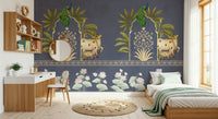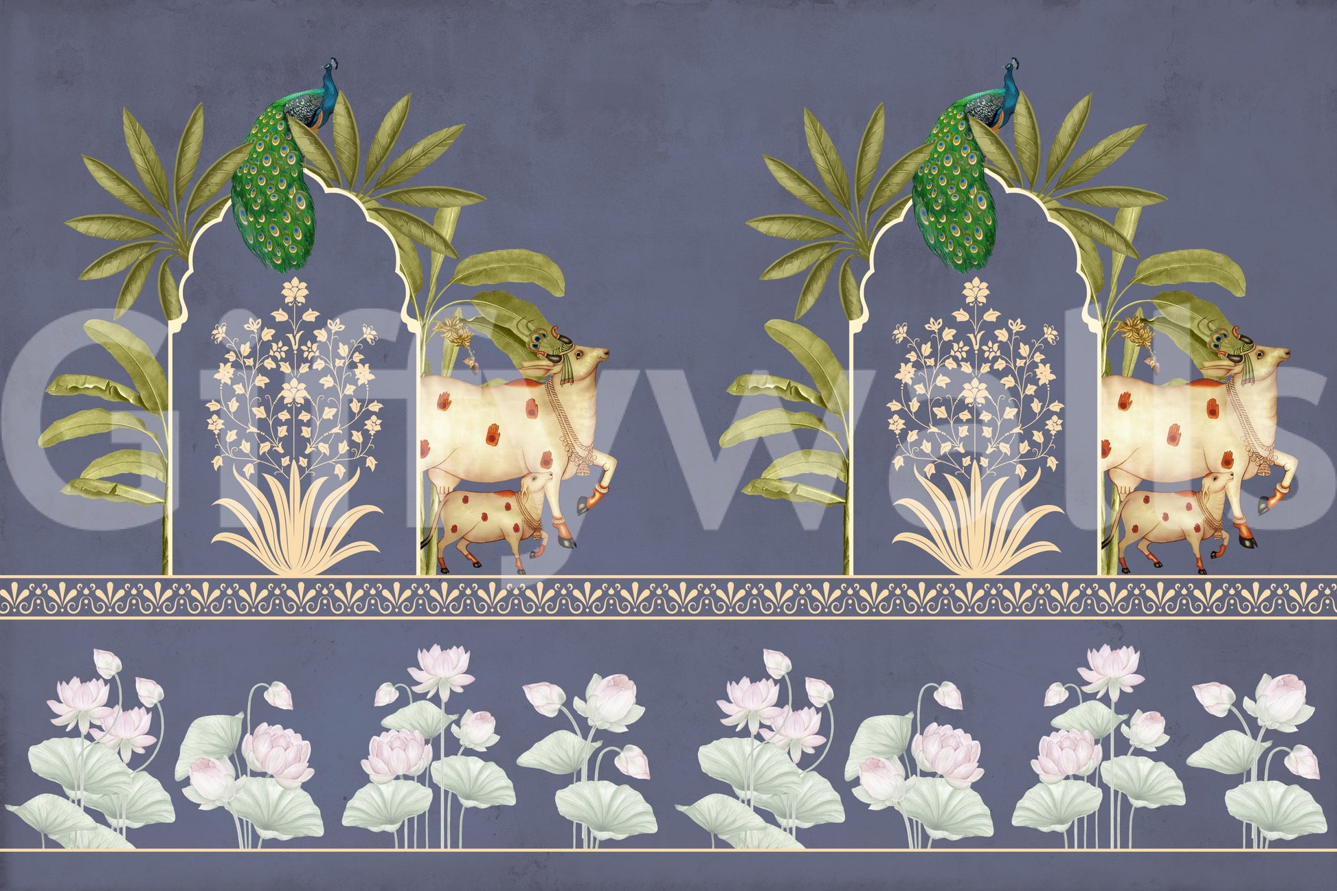 Step into a serene sanctuary with "The Neelambar Arch," a wall covering imbued with the tranquil essence of Indian artistry. The design features an archway framing a scene of stylized flora and fauna. Majestic peacocks perch gracefully atop verdant palm fronds, their jewel-toned plumage a striking contrast against the rich, deep blue (Neelambar) backdrop. Sacred cows, adorned with symbolic markings and traditional jewelry, evoke a sense of reverence and prosperity. The lower section showcases a delicate array of blossoming lotuses, their soft pink hues adding a touch of gentle femininity. This piece draws inspiration from traditional Indian miniature paintings, re-imagined for the modern home. Invite a sense of heritage and peaceful grandeur to your living space with this wallcovering that speaks of ancient wisdom and timeless beauty, creating a focal point that is both captivating and calming.