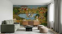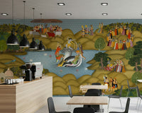 Step into a world of vibrant artistry with "The Palace Jali," a design that echoes the grandeur of royal Indian courts. Imagine walls adorned with a scene teeming with life, a harmonious blend of mythology and nature. This ornate design depicts a flowing river landscape with mythological figures in various activities. Lush greenery and serene water features are brought to life through intricate details and rich, warm color palettes, reminiscent of classical miniature paintings. The patterns within the architecture are reminiscent of a "Jali". A symbol of heritage, this artwork is more than just a decoration; it's a conversation starter, a window into a timeless narrative, and a testament to refined taste. It is certain to create a space that is both elegant and inviting, transporting you to a realm of beauty and wonder.