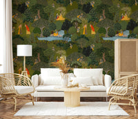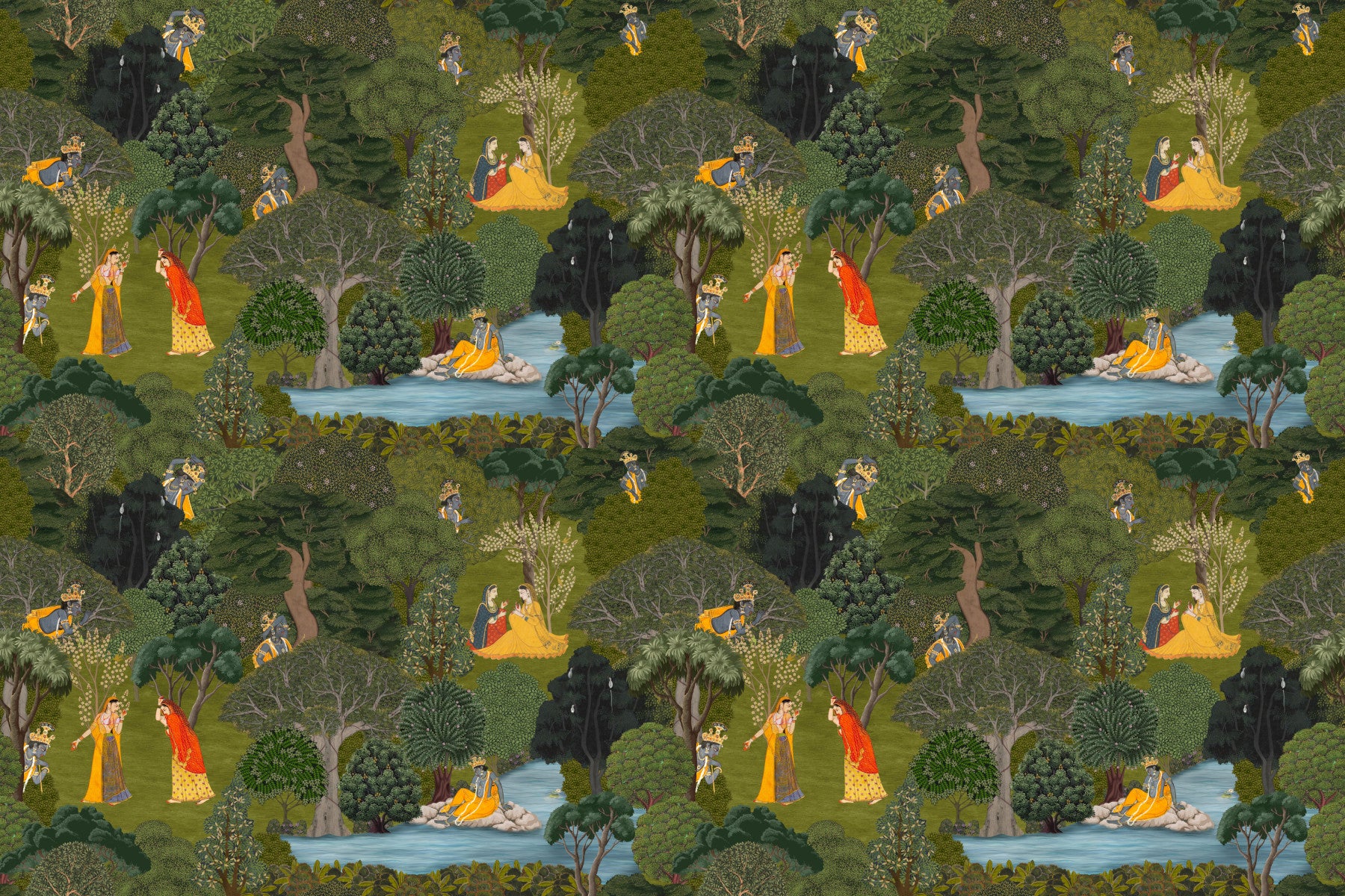 Immerse yourself in 'The Pichwai Grove,' a lush and captivating piece of wall décor that breathes life into any room. Inspired by traditional Pichwai paintings, this design depicts a serene grove filled with vibrant flora and intriguing figures. The intricate details reveal a world of ancient tales, with ethereal beings resting amidst the verdant foliage, by the gentle river flowing through the grove. The rich textures and earthy tones evoke a sense of tranquility and wonder, creating an enchanting atmosphere. Let this wall art transport you to a world of timeless beauty and mystical narratives, adding a touch of cultural richness and sophisticated charm to your living space. Embrace the artistry and storytelling woven into every detail of this evocative design.