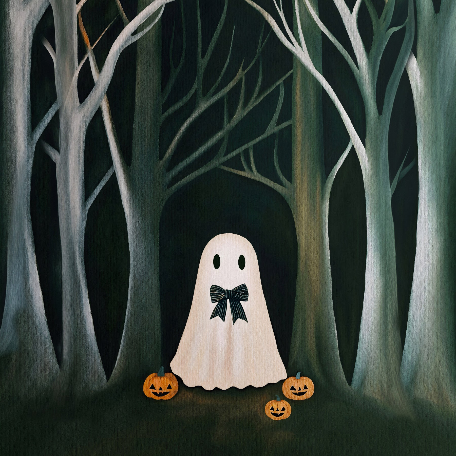 Step into a whimsical world of spectral sophistication with The Preppy Ghost wallpaper. This unique design blends the spooky charm of Halloween with a touch of refined elegance. A dapper ghost, sporting a perfectly tied bow tie, takes center stage in a stylized autumnal forest. Illuminated pumpkins flank the spectral figure, casting a warm, inviting glow amidst the stark, bare trees. The deep forest background and pale tree trunks create a visually striking contrast, perfect for adding a distinctive, high-spirited vibe to your screens. Perfect for Halloween but stylish enough to keep up year-round. It's a hauntingly handsome addition to any digital collection, combining the playful with the polished.