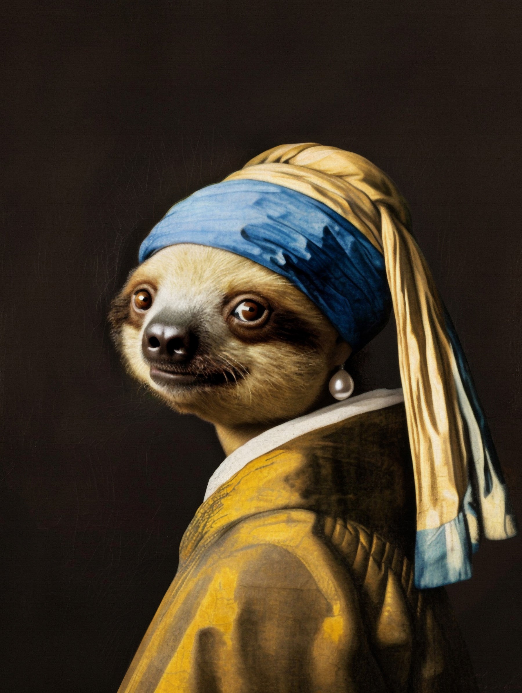 A charming and whimsical reinterpretation of a classic portrait, featuring a gentle sloth adorned with the iconic pearl earring and wrapped in a flowing yellow robe. Painted with rich detail and a dark, textured background, this artwork combines Renaissance elegance with playful creativity. The sloth’s serene gaze and soft fur add warmth and personality to this unique piece. Perfect for animal lovers, eclectic interiors, and anyone seeking a lighthearted twist on timeless art.