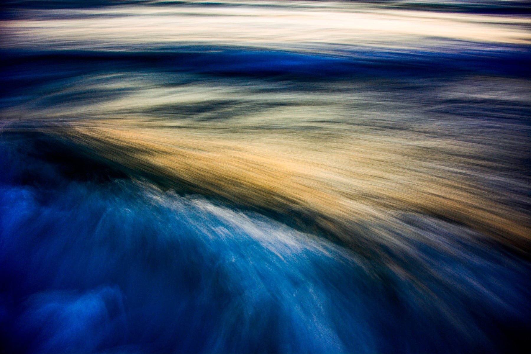 The Uniqueness of Waves VI captures the ethereal dance of water and light in a mesmerizing abstract. This wallpaper evokes a sense of calm and wonder, showcasing the fluid beauty of waves in perpetual motion. Cobalt blues and shimmering gold blend seamlessly, creating a dynamic yet soothing visual experience. The intentional blurring creates an impression of movement and flow, inviting contemplation on the ever-changing nature of the ocean. Let the unique energy of this wave transform your screen into a portal to the boundless sea, offering a tranquil escape and a reminder of the power and beauty inherent in the natural world. Ideal for those seeking a calming and artistic digital backdrop.