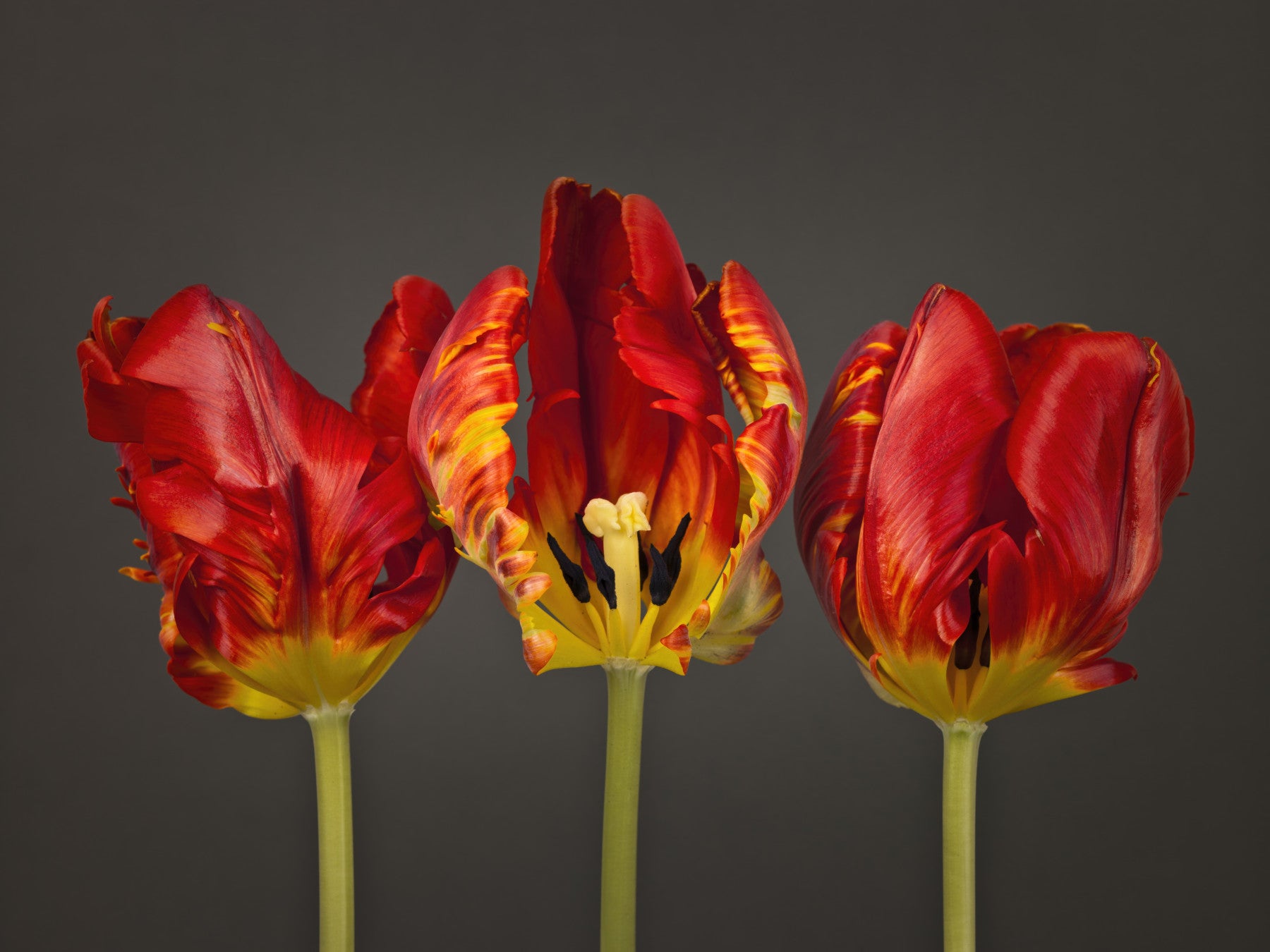 Three red and yellow Rococo tulips in wall mural design