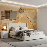 Bring visual depth and historical intrigue into your space with this textured wallpaper. Layers of aged plaster peel away, revealing brickwork and a weathered window, creating a tactile and visually engaging surface. The neutral color palette of beige, brown, and grey coordinates with various décor styles, from classic to contemporary. This wallpaper for walls is perfect for a bedroom, study, or dining area, adding a unique touch of character. It transforms plain surfaces into captivating features and amplifies the ambiance of any interior.