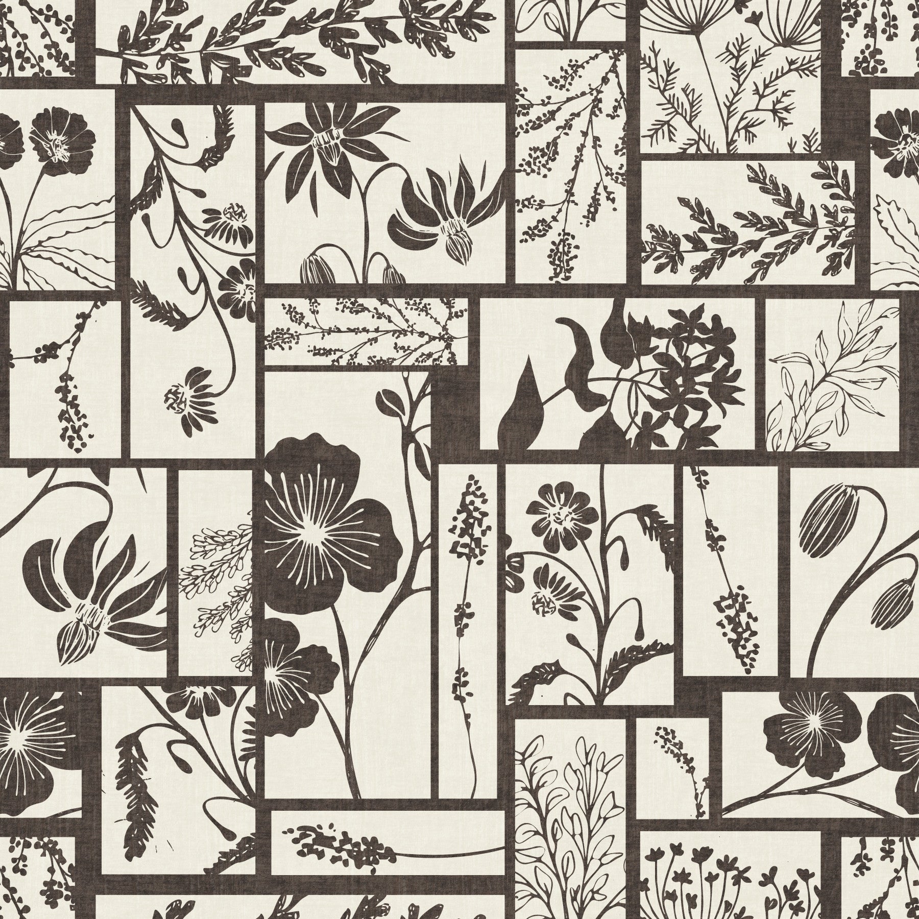 This captivating wallpaper for walls brings a sophisticated botanical aesthetic to any interior. It features an intricate patchwork of hand-drawn flora, arranged in various rectangular blocks. Each panel showcases unique plant illustrations, from delicate ferns to bold blooms, rendered in a rich, earthy brown against a warm cream background. The monochromatic palette creates a calming yet impactful visual. This design effortlessly complements a rustic, vintage, or modern farmhouse style. Install it in a living room to create a captivating feature wall, or use it in a cozy bedroom or serene home office to infuse natural charm and texture. The distinct block arrangement adds depth and a unique artistic touch, transforming your space with understated elegance.