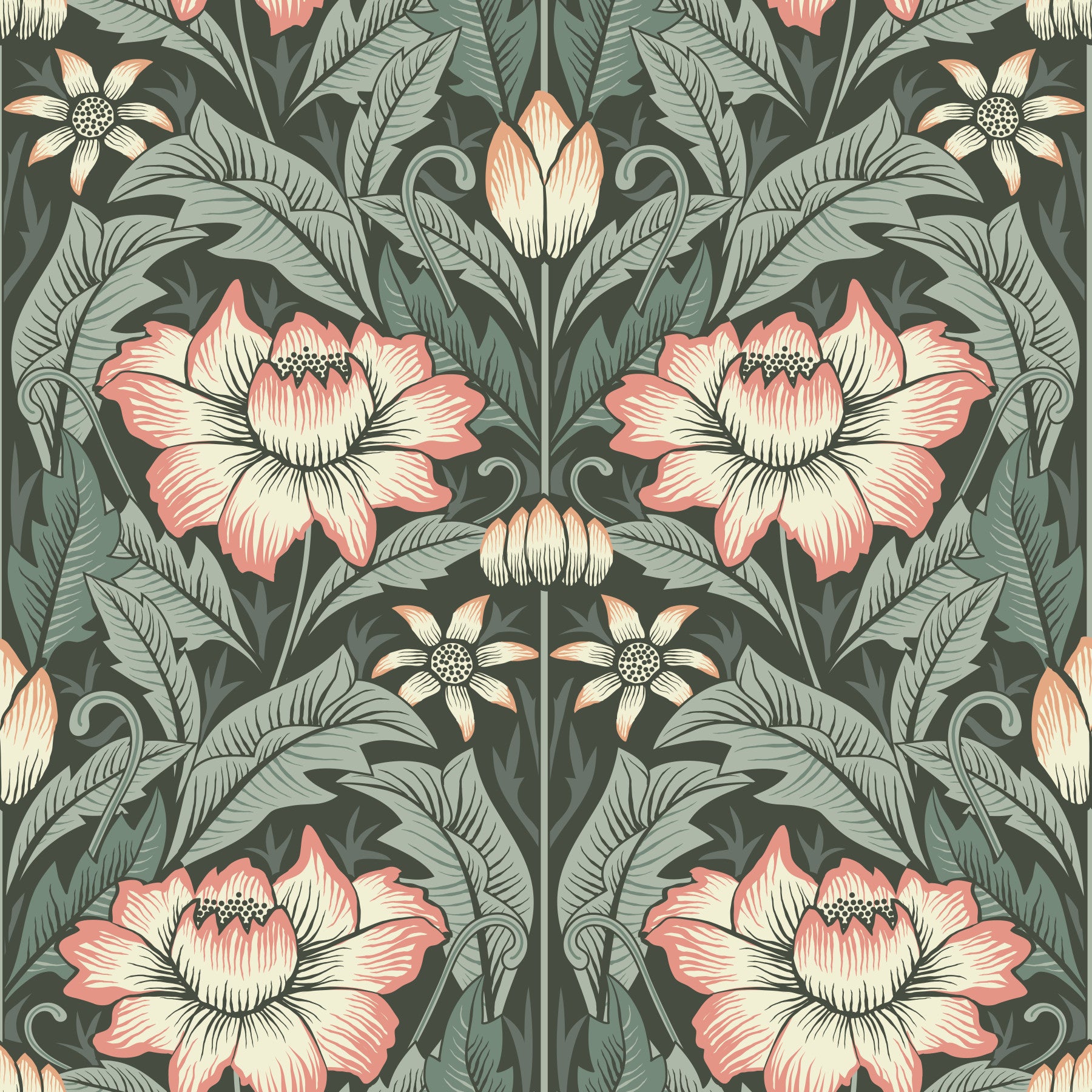 Dark green and rose blooms of the Forest Green Wallpaper covering a space.