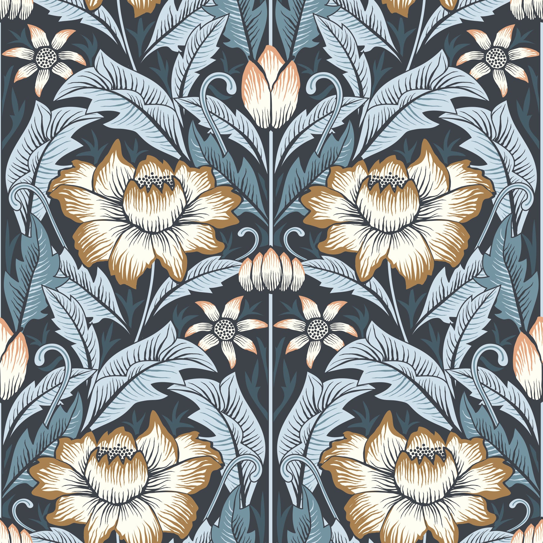Intricate Arts and Crafts style pattern in cream, bronze, and midnight blue.