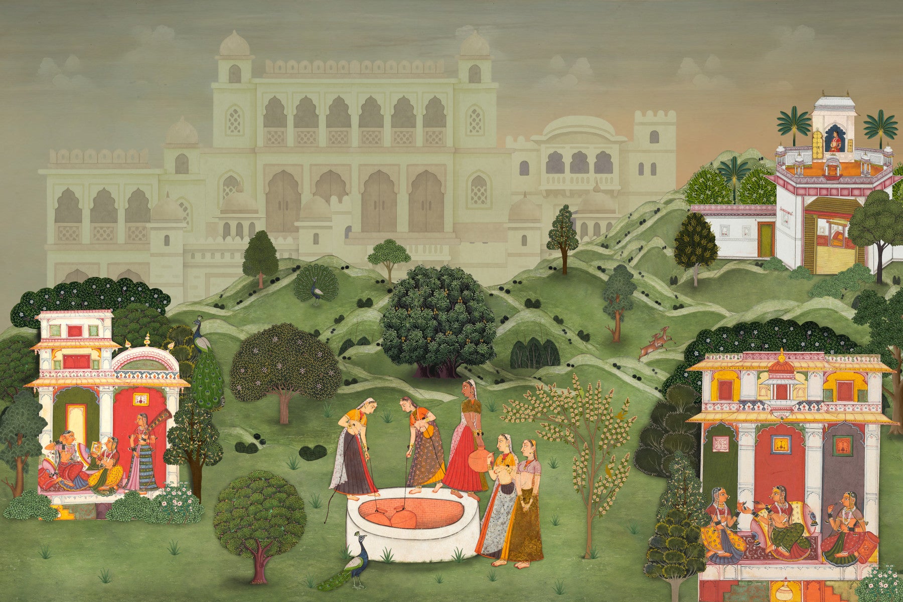This exquisite wallpaper for walls presents a captivating scene from an Indian palace garden, rendered in the intricate style of traditional miniature painting. Lush green hills flow across the design, dotted with vibrant trees and elegant peacocks displaying their plumage. Women in richly colored attire engage in daily life by a well and within ornate pavilions. A grand, muted palace rises subtly in the background, creating a sense of depth and history. This design introduces a serene, culturally rich ambiance, making it perfect for a living room, dining room, or bedroom. The earthy color palette with its pops of crimson, gold, and emerald green adds warmth and sophistication, transforming any space into an elegant retreat.