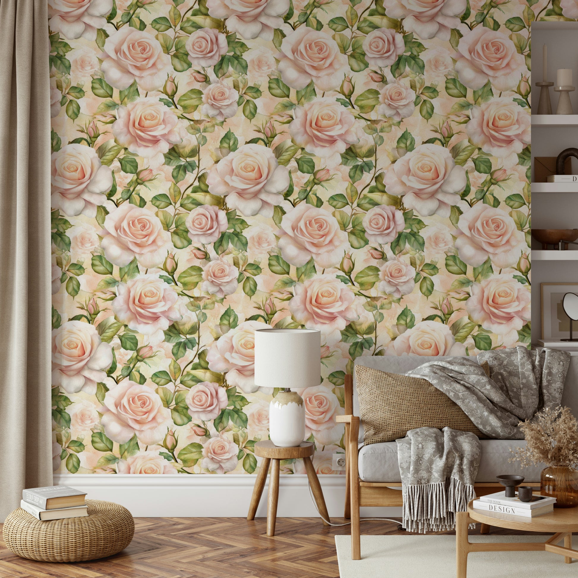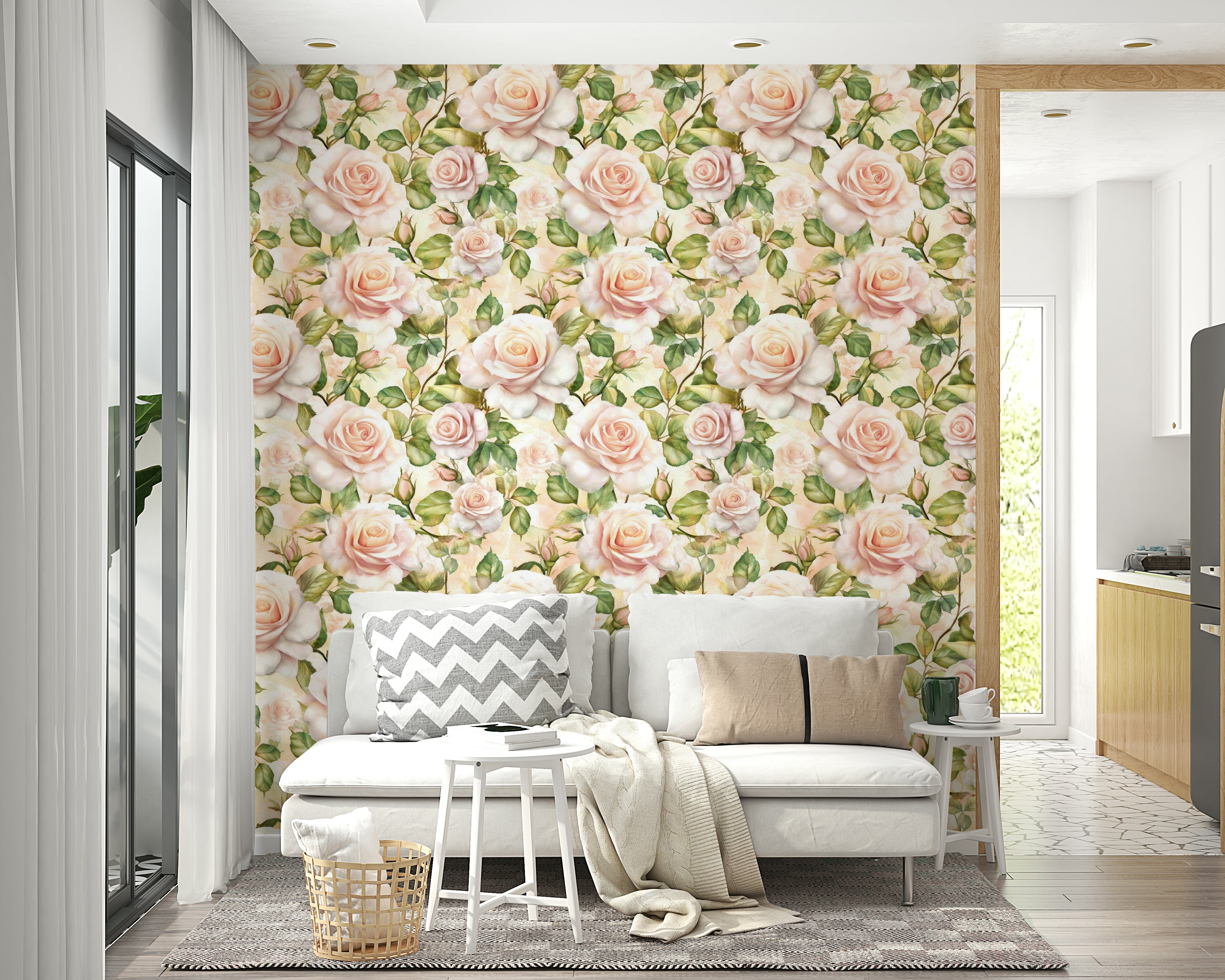 This detailed watercolor pattern transports you to a romantic rose garden full of grace and delicacy. The lovingly designed flowers in soft rose and cream colors unfold on a soft, pastel background and convey an atmosphere of elegance, lightness and timeless beauty. The fine green tones of the leaves set natural accents and emphasize the floral character. This design stands for floral sophistication and poetic aesthetics.