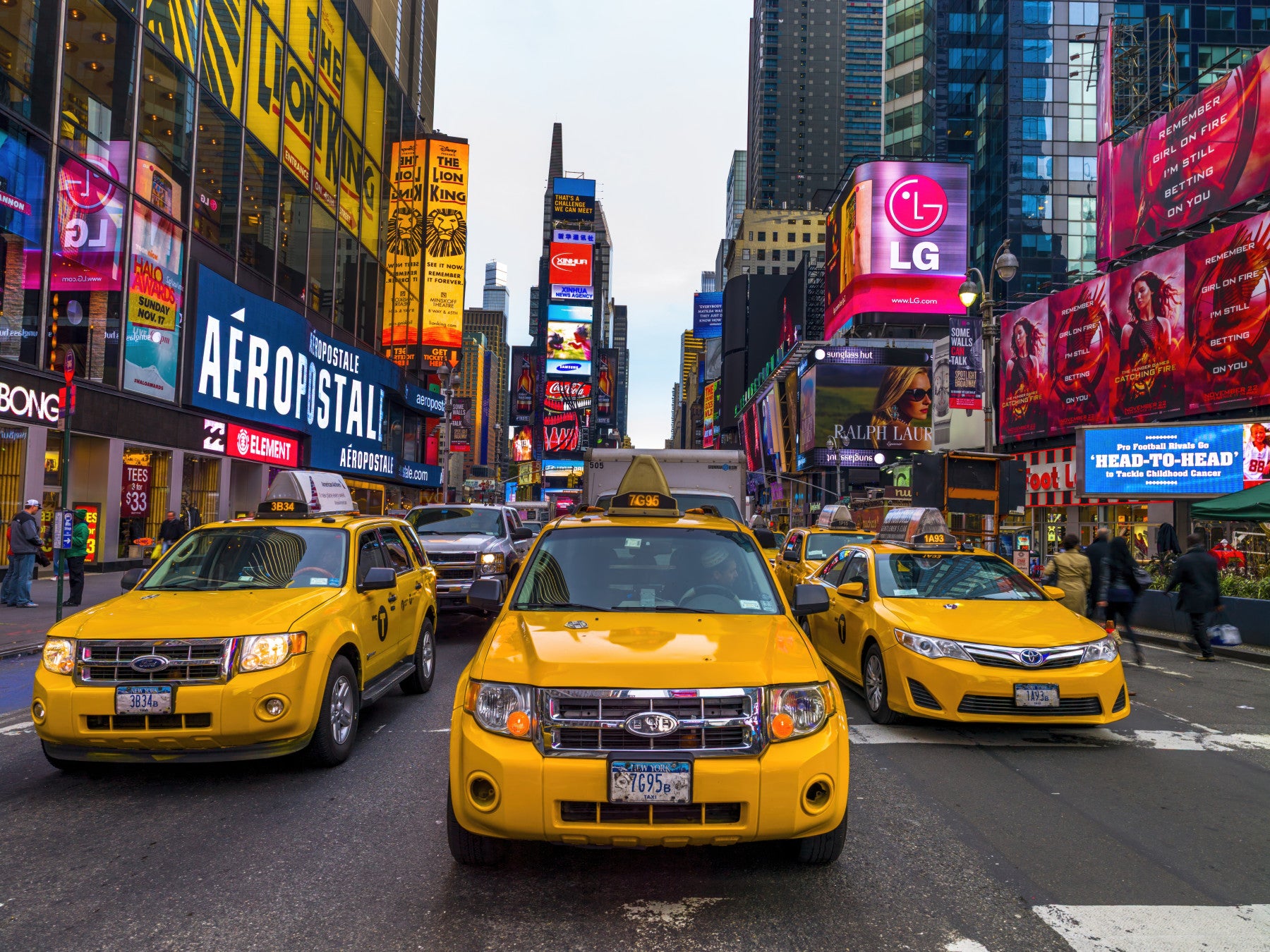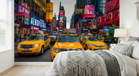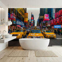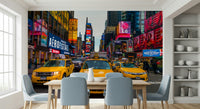 Taxis on Broadway, New York. Experience the electric energy of Times Square with this lively wallpaper for walls. Vivid yellow taxis navigate the bustling streets, surrounded by towering billboards blazing with color. The composition captures the essence of New York City's vibrant atmosphere, bringing an urban edge to any room. This design works well in modern living rooms, creative offices, or teen bedrooms, adding a dynamic focal point that complements contemporary interiors. It creates an energetic and stylish backdrop, perfect for spaces that celebrate city life.