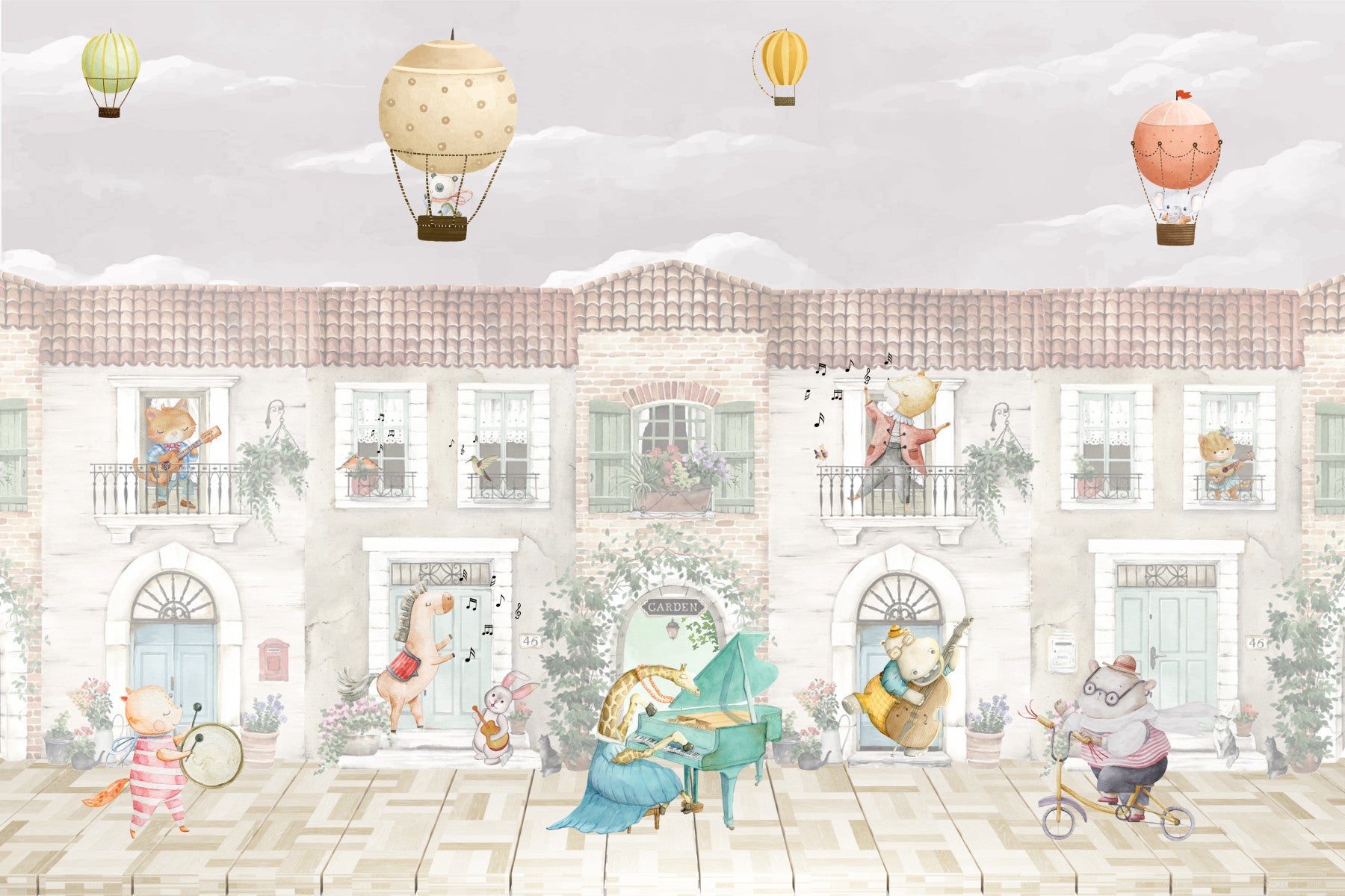 Transport yourself to a storybook setting with this charming wallpaper. Adorable animal musicians delight from balconies and streets, while hot air balloons drift across the sky. With gentle colors, it provides a delightful focal point. This wallpaper for walls will enrich your nursery or kid's bedroom with its gentle charm and adds wonder. Harmonize with natural wood accents and bright accessories for a fun-filled design. Encourage imagination and creativity with this whimsical scene.