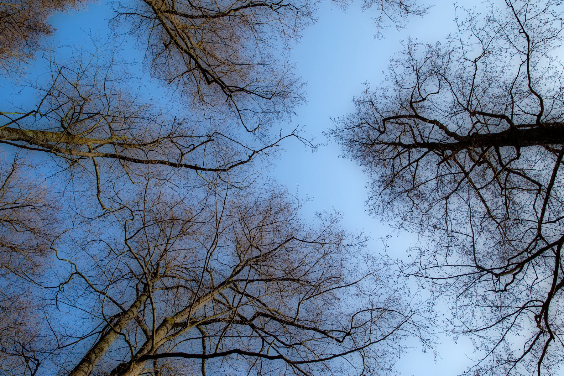 Tranquil Canopy A Serene View of Bare Trees Against a Blue Sky Wall Mural