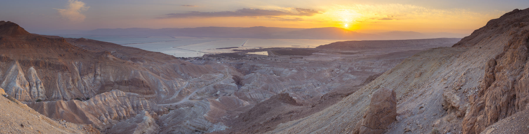 Sunset in Negev Desert, Israel. Bring the serene beauty of a desert sunrise to your home with this stunning panoramic wallpaper. The warm hues of orange and gold paint the sky, reflecting softly on the calm waters of the Dead Sea. The textured mountains in the foreground provide depth and contrast, creating a captivating focal point for any room. Perfect for creating a relaxing and contemplative space, this wallpaper is ideal for bedrooms, studies, or meditation areas. Let the beauty of nature transform your living environment.