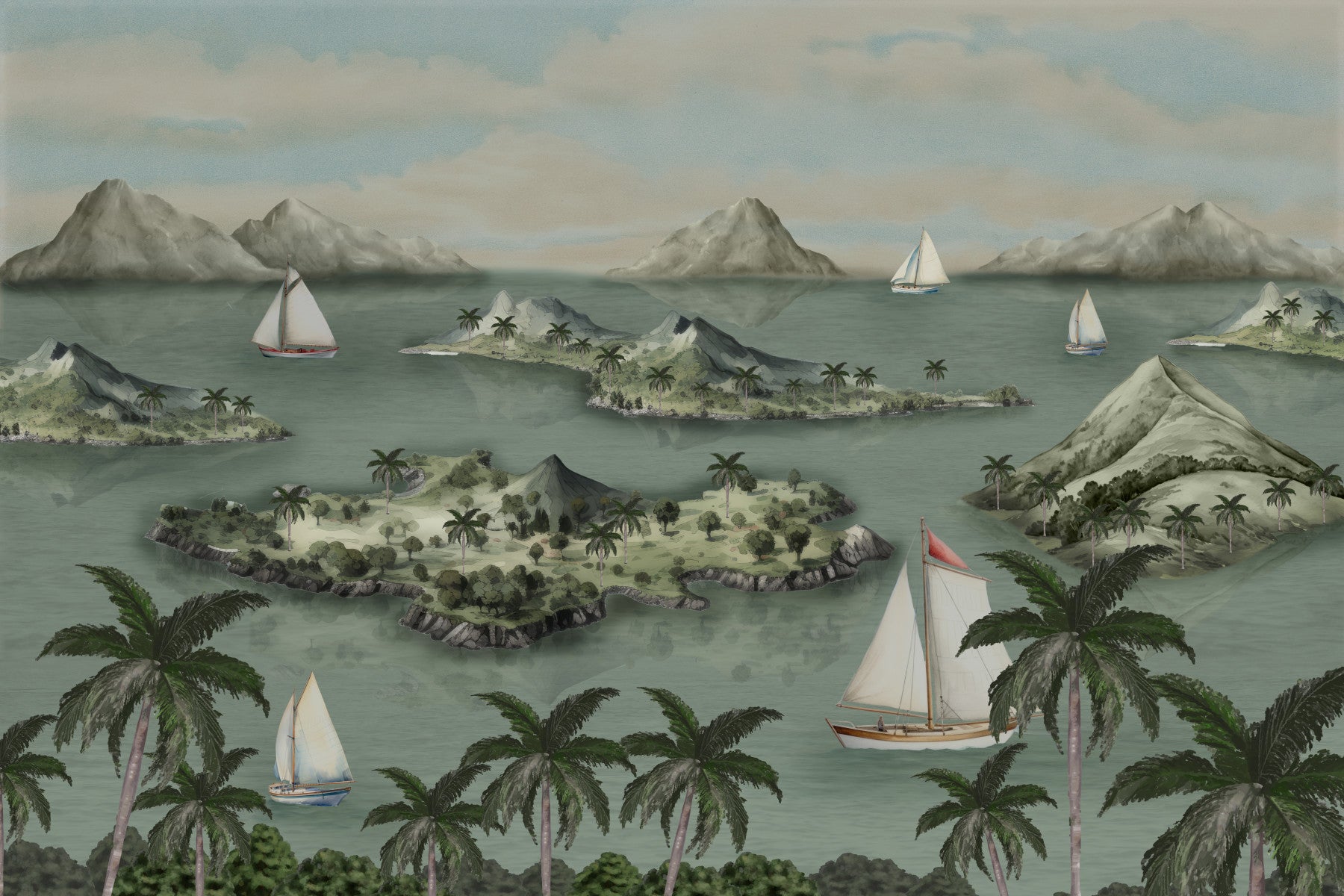 Escape to paradise with this calming island scene. Elegant sailboats drift along serene waters, surrounded by lush islands and misty mountain peaks. The muted tones and classic art style bring a sense of calm and relaxation. This wallpaper for walls works beautifully in any space. Transform your bedroom, living room, or study into a tranquil escape. The subtle design complements any interior style, creating a soothing and sophisticated environment. Bring the beauty of island life home!