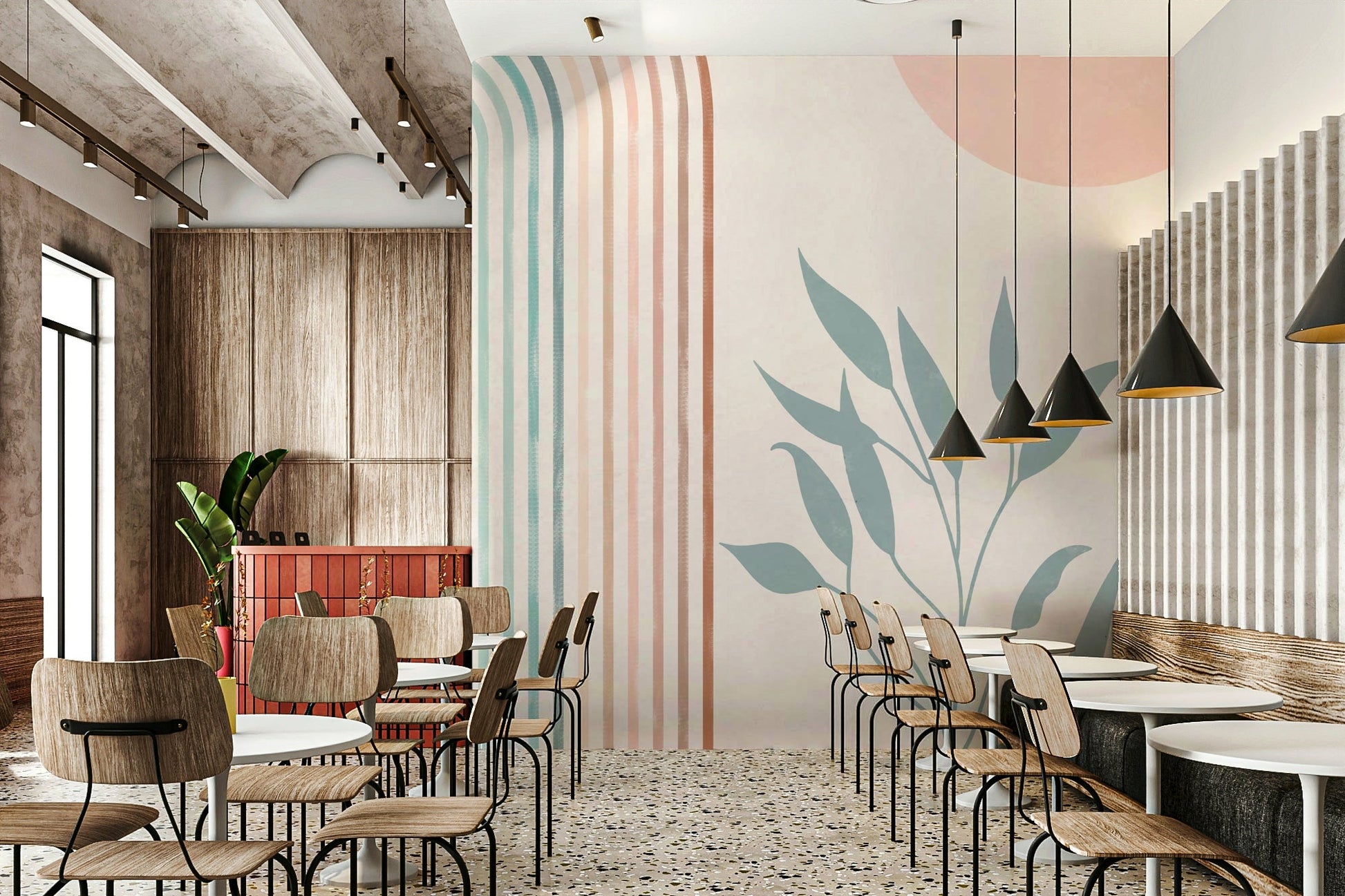 Escape to a world of tranquility with this calming wallpaper. The soft rainbow arc, in muted pastel hues, offers a gentle visual journey, complemented by the serene elegance of stylized teal foliage. A delicate blush pink circle anchors the design, adding a touch of warmth and sophistication. The understated beauty and minimalist aesthetic create a peaceful retreat, perfect for bedrooms, living rooms, or any space desiring a touch of sophisticated serenity. The overall design exudes a calming and peaceful atmosphere.
