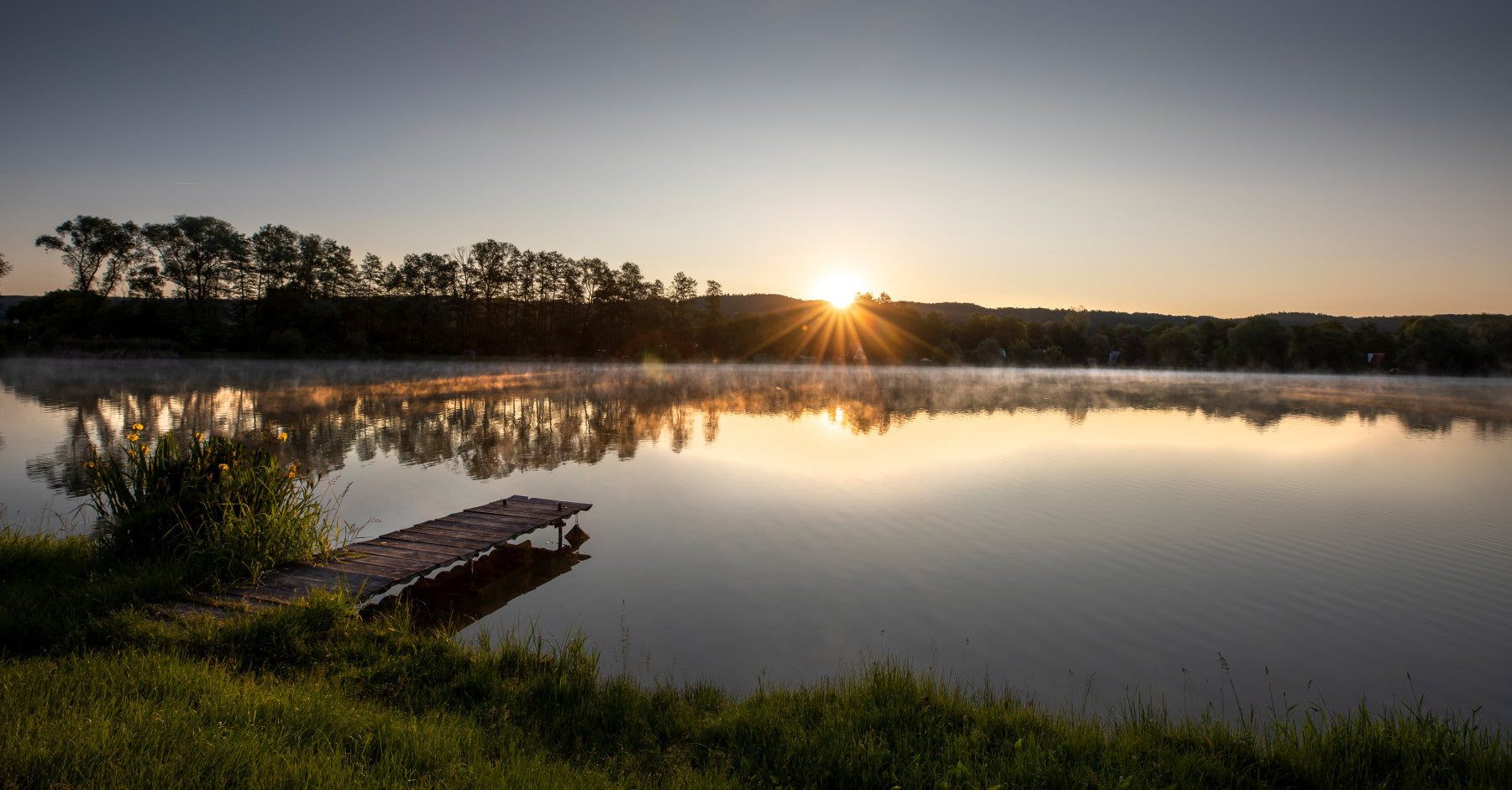 Features a serene lake landscape with the sun rising, casting a soft, golden light.