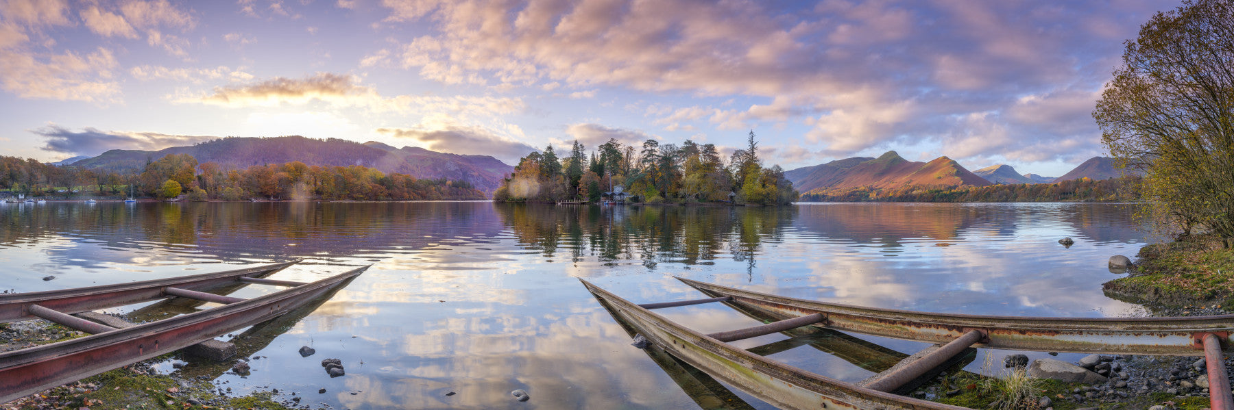 Derwent island at sunrise, Derwentwater. Transform any room with this breathtaking lake view. The wallpaper for walls shows mirrored skies and autumnal trees reflected in crystal clear water. Distant mountains create depth and grandeur. This design provides a relaxing atmosphere in bedrooms, offices, or living spaces. The soft light and natural colors blend well with both modern and classic decor. The tranquil image creates a peaceful escape from the hustle and bustle of everyday life.