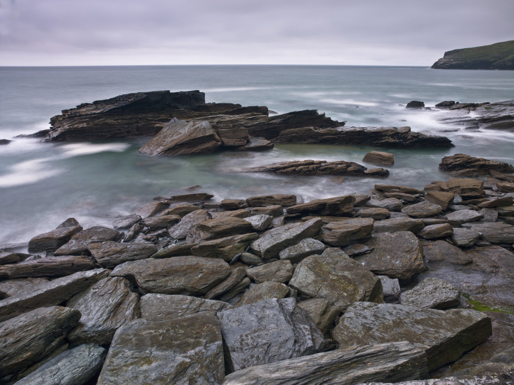 Trebarwith Strand. Immerse yourself in the raw beauty of the Cornish coast with this stunning Trebarwith Strand wallpaper. Capturing the rugged allure of the North Cornwall shoreline, the image showcases the dramatic interplay between the weathered rocks and the ethereal movement of the sea. A long exposure technique renders the water into a silken veil, contrasting sharply with the solid, stratified layers of the dark stone formations. The subdued, almost monochromatic palette evokes a sense of tranquility and solitude, punctuated by subtle turquoise hues in the receding tide. The overcast sky hints at the ever-changing coastal weather, adding a touch of atmospheric drama. This wallpaper brings the captivating spirit of Trebarwith Strand to your screen, offering a daily escape to the wild and untamed beauty of the British seaside.