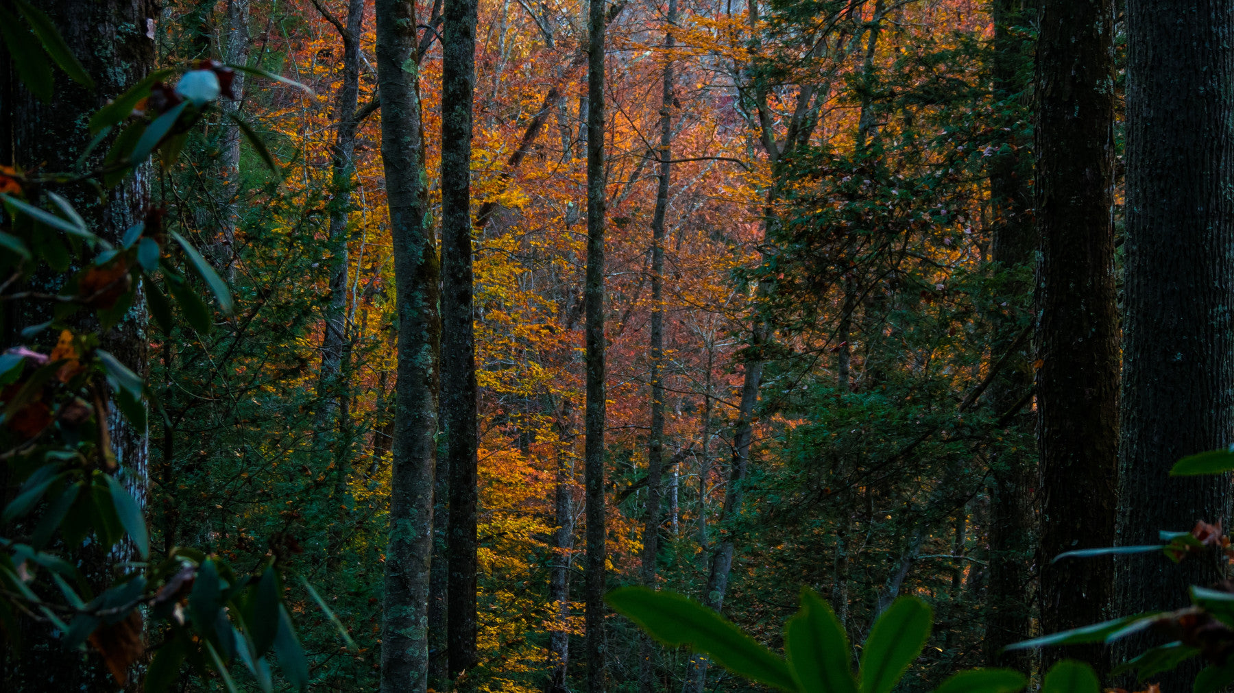 Immerse yourself in the tranquil beauty of 'Tree Forest,' a stunning wallpaper that captures the essence of an autumnal woodland. Towering trees, their bark textured and deep in shadow, stand as silent sentinels, framing a vibrant tapestry of orange and gold foliage. The interplay of light and shadow creates a sense of depth and mystery, inviting you to lose yourself in the forest's embrace. The image is punctuated by patches of evergreen, reminding us of nature's enduring strength. This wallpaper evokes a feeling of peaceful solitude, making it a perfect addition to any space where you seek calm and connection with the natural world. Let the subtle details and rich colors of 'Tree Forest' transform your screen into a portal to the serenity of the woods.