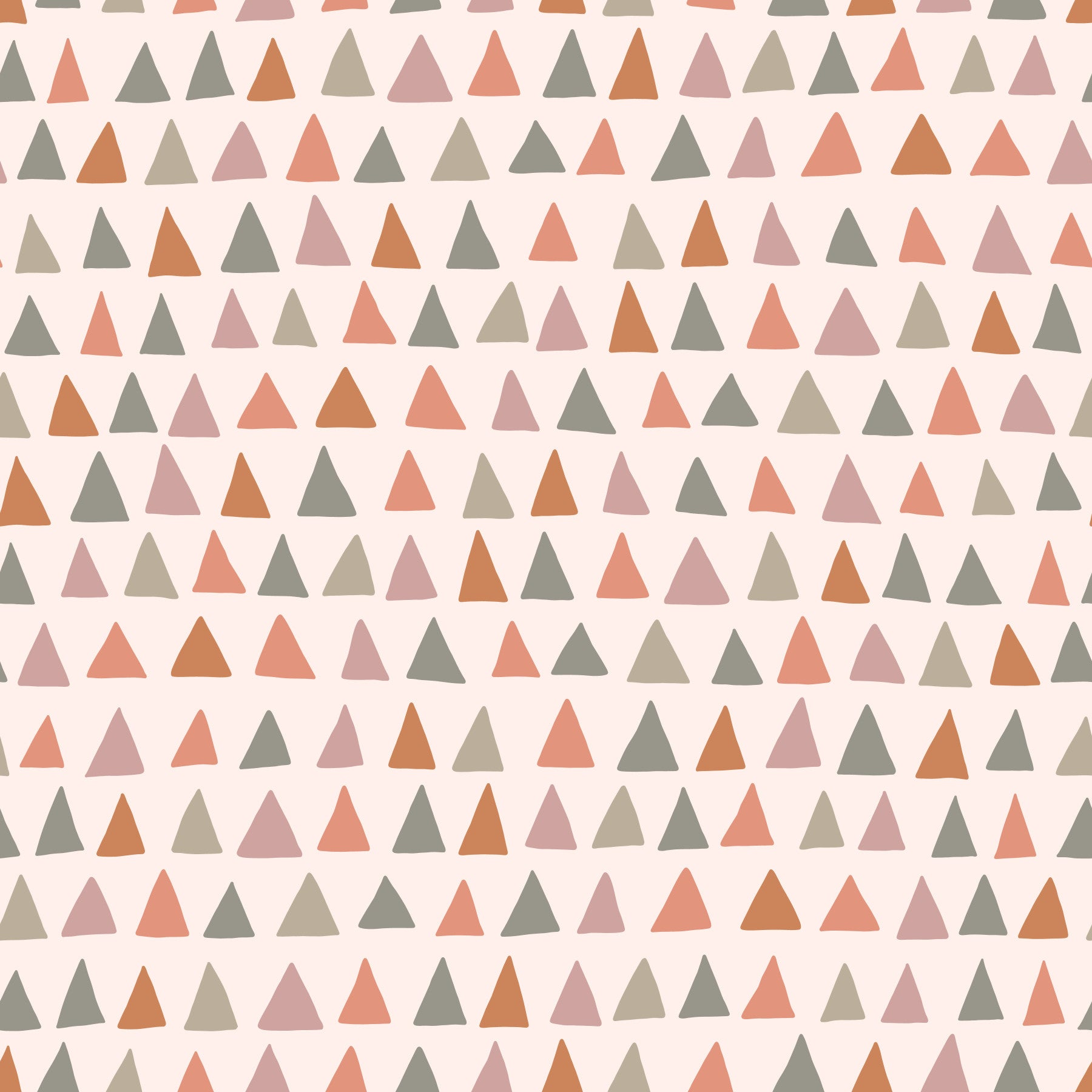 Embrace the serene beauty of the 'Triangle Multicolor Woodland' wallpaper. This design features a captivating arrangement of hand-drawn triangles in a soft, earthy palette. Muted pinks, warm oranges, and calming greys create a gentle, whimsical atmosphere reminiscent of a sun-dappled forest floor. The repeating pattern is both simple and sophisticated, offering a tranquil visual experience perfect for creating a calm and inviting space. Its subtle elegance makes it equally suitable for living rooms, nurseries and kids rooms, adding a touch of understated woodland charm to your daily life.
