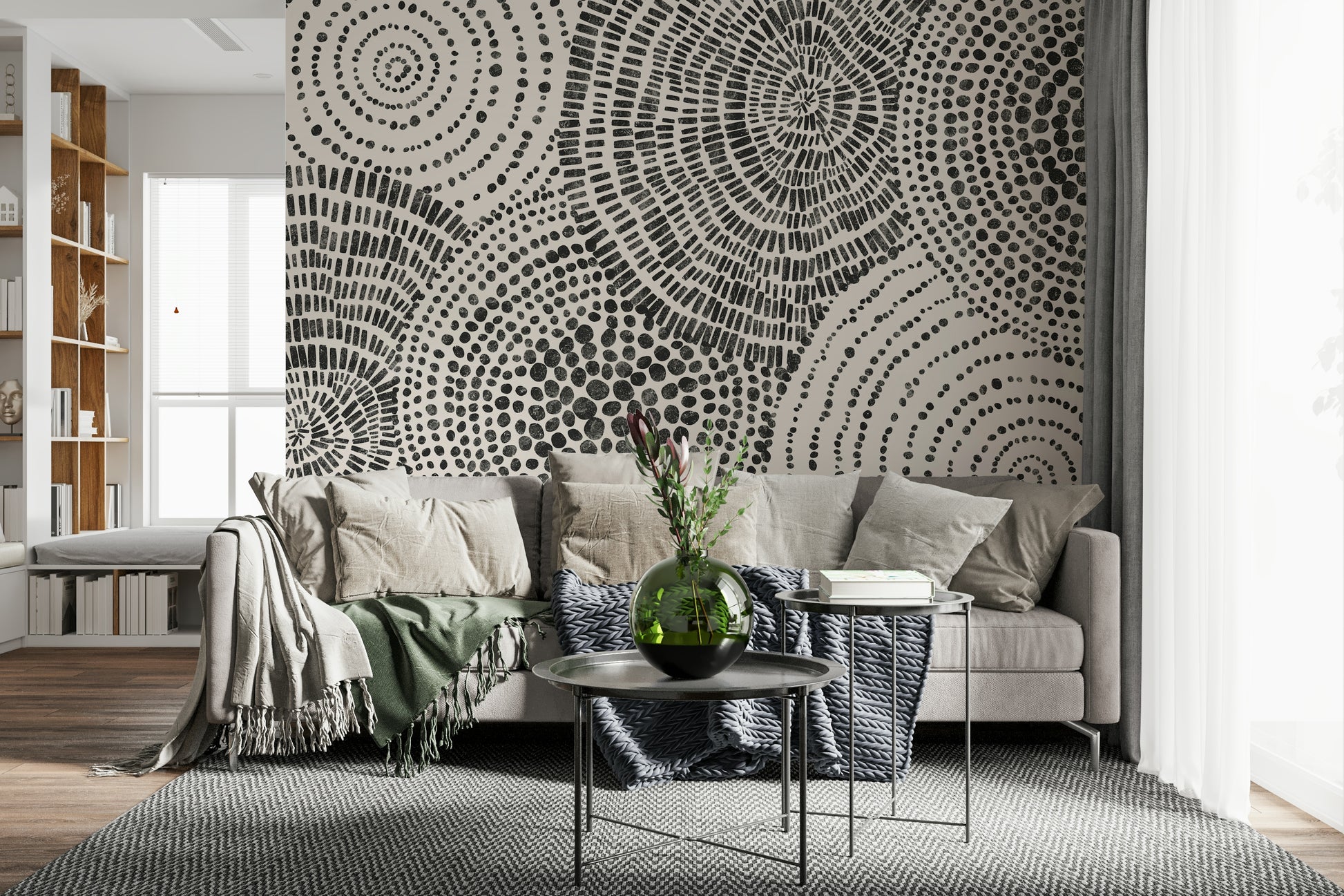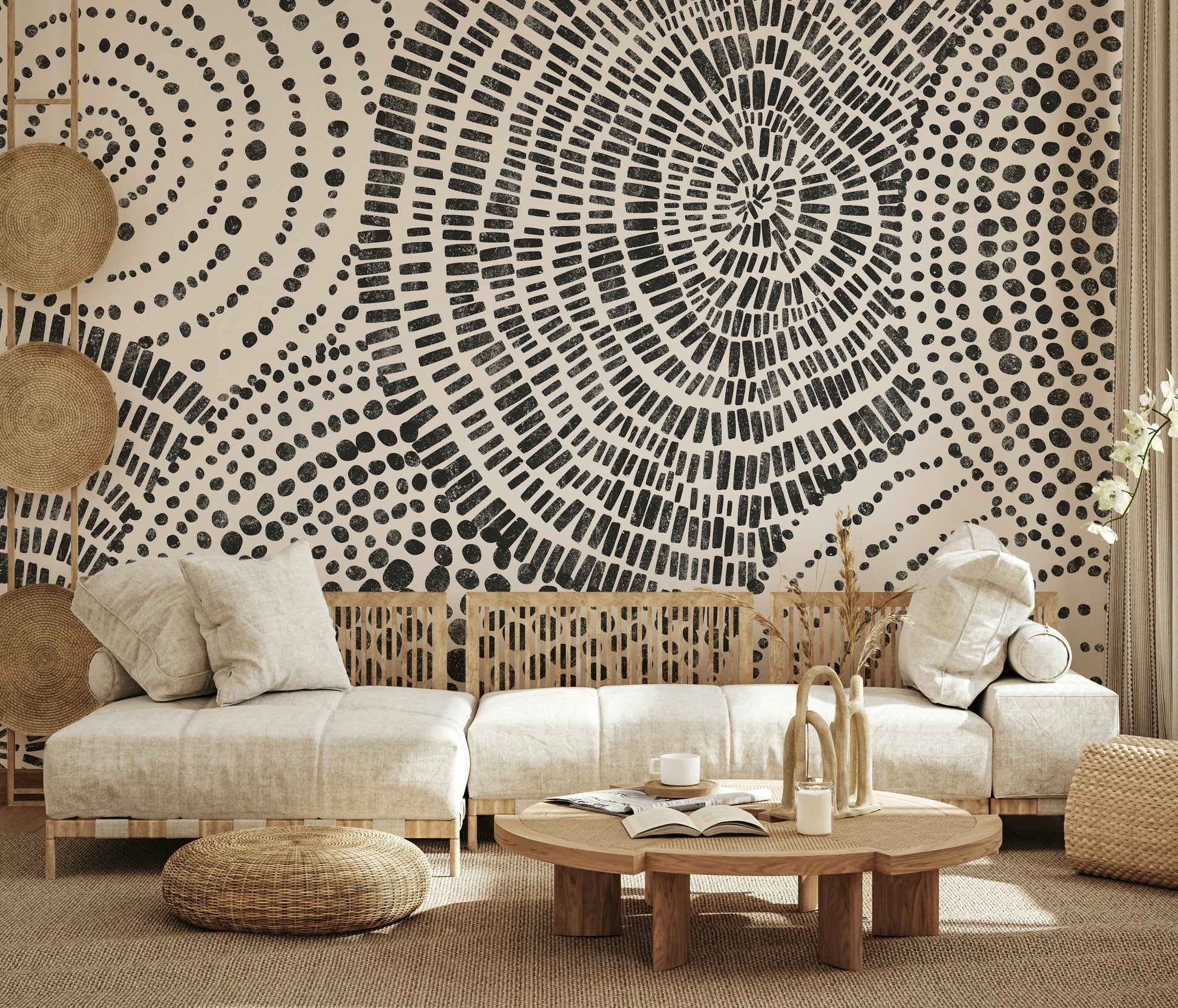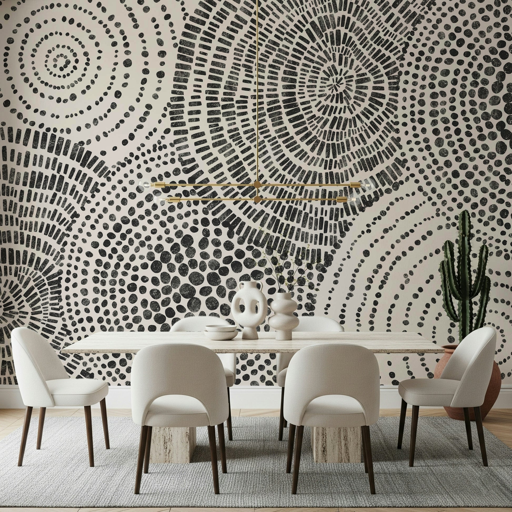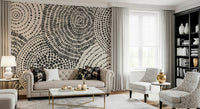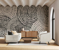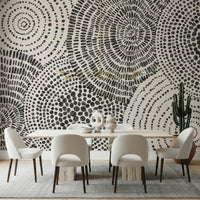 Immerse your space in the captivating "Tribal Rhythms" wall décor, a mesmerizing exploration of primitive patterns and organic forms. This artful arrangement features concentric circles and radiating segments, reminiscent of ancient tribal markings and the rhythmic pulse of indigenous music. Hand-drawn imperfections add an authentic, textural quality, lending a sense of history and raw energy. The interplay between densely packed dots and bolder, linear strokes creates a dynamic visual tapestry, inviting the eye to dance across the wall. The neutral palette exudes understated elegance, allowing the intricate design to take center stage. Perfect for adding a touch of global sophistication and timeless appeal to any room, the "Tribal Rhythms" design transforms your walls into a canvas of earthy beauty and rhythmic intrigue, echoing the stories and traditions of faraway lands.