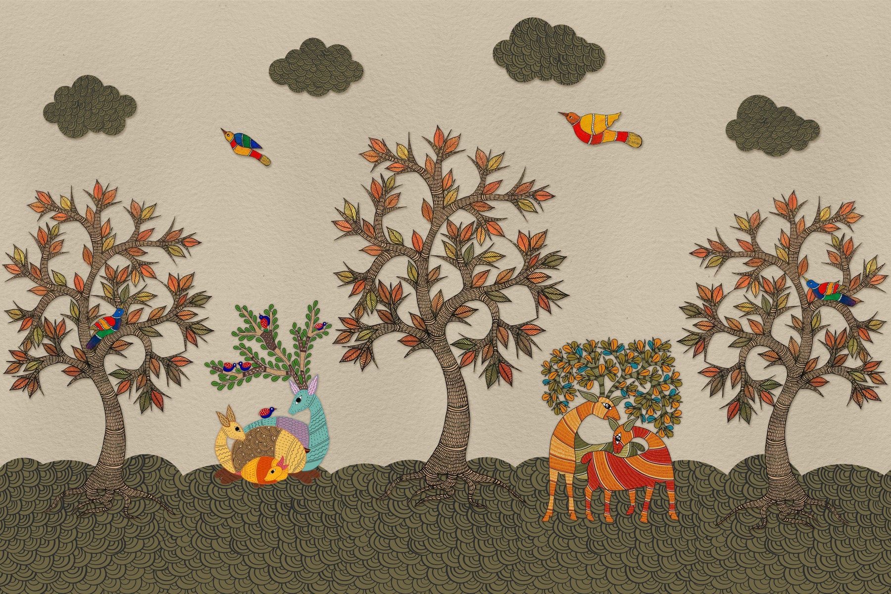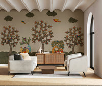 Transform your space with this enchanting tribal woodland wallpaper for walls. This design showcases hand-drawn trees, birds, and stylized animals, all brought to life with a warm, earthy color palette of beige, olive green, and touches of red, blue and orange. The intricate line work and pattern details create a captivating and whimsical scene, perfect for bringing a sense of nature and folklore into living rooms, bedrooms, or even a cozy reading nook. It enhances walls with its whimsical illustration of a woodland scene, fostering an inviting atmosphere.