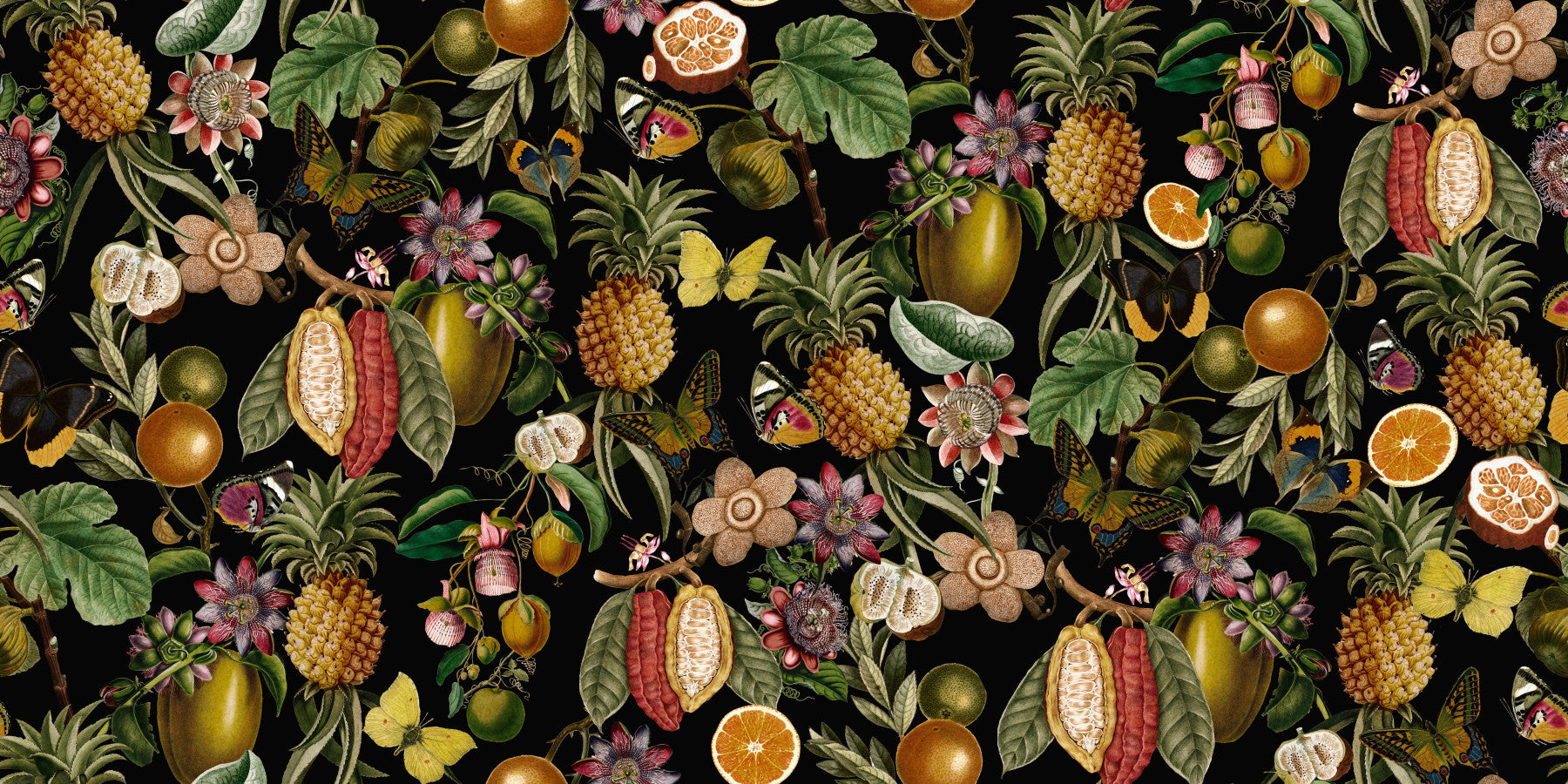 Immerse yourself in a vibrant tapestry of tropical flora and fauna. This wallpaper showcases a lavish arrangement of pineapples, passion flowers, cocoa pods, oranges, and figs, all rendered in exquisite detail against a deep black background. Butterflies flit amongst the lush greenery, adding a touch of playful movement to the rich, almost painterly composition. The design evokes a sense of exotic opulence and timeless elegance, ideal for adding a touch of sophisticated luxury to any space. The detailed botanical illustrations are a feast for the eyes, creating a striking and memorable visual experience.