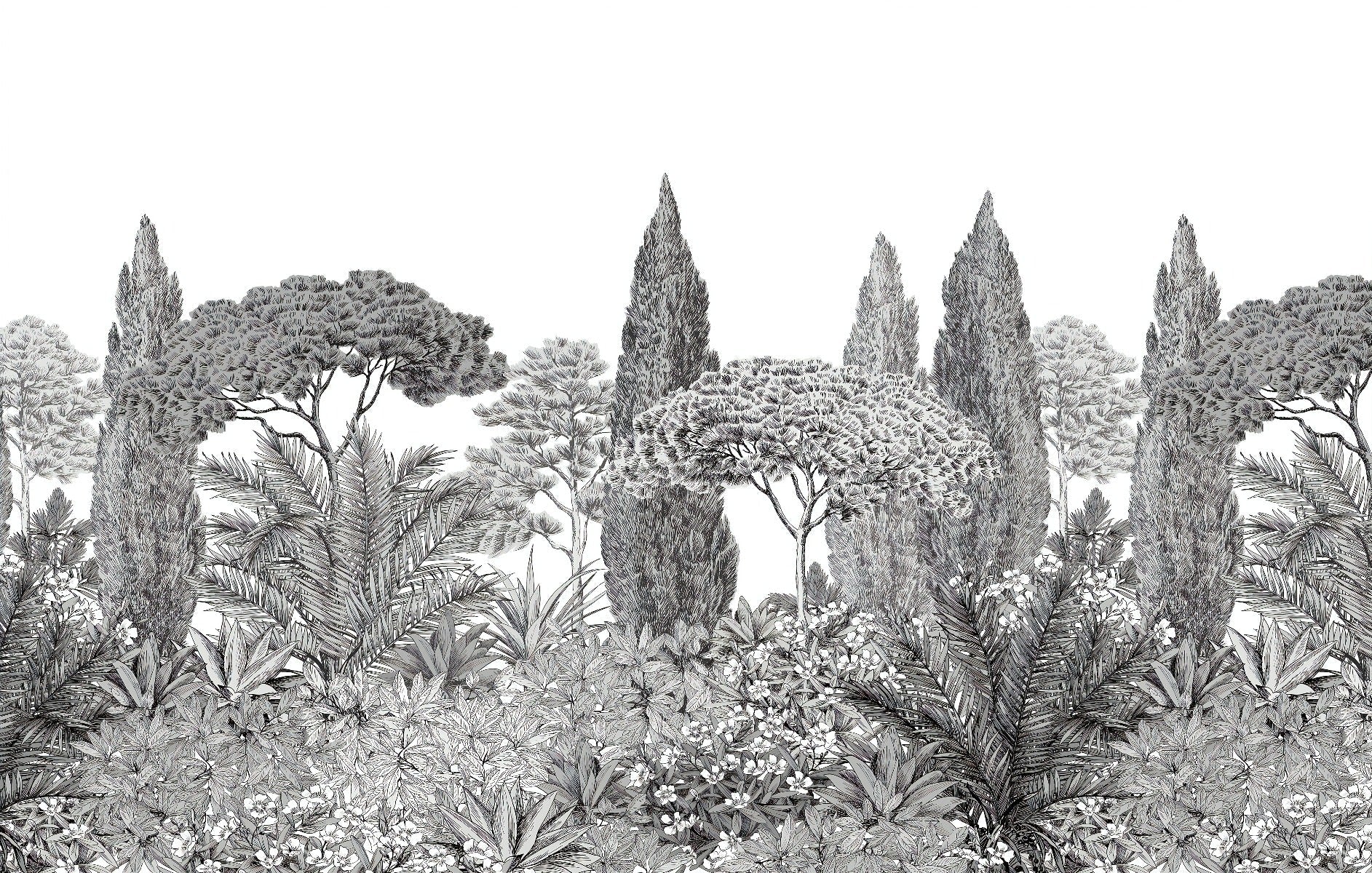 Add an ambience to your home with our slate grey panoramic etched trees scene wallpaper mural. This unique design has beauty and a theatricality woven into one dramatic show. Its base, an unassuming grey with suggestions of breezed blue, makes it a peaceful setting. The more striking shades of grey found in the palm and coconut trees are unveiled on this peaceful ground. The result? It is an exciting mural that immediately improves a room's appearance.