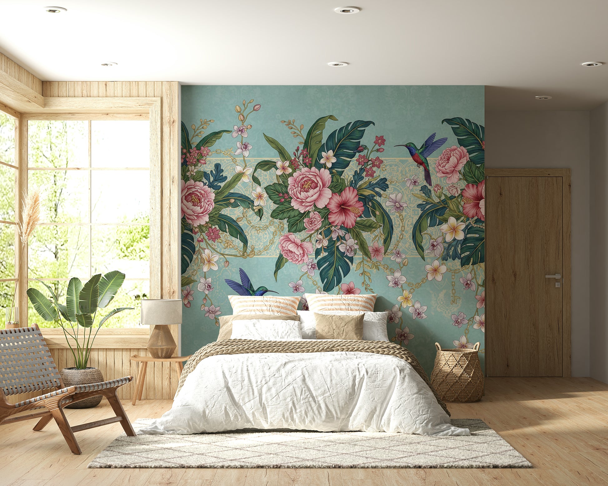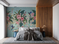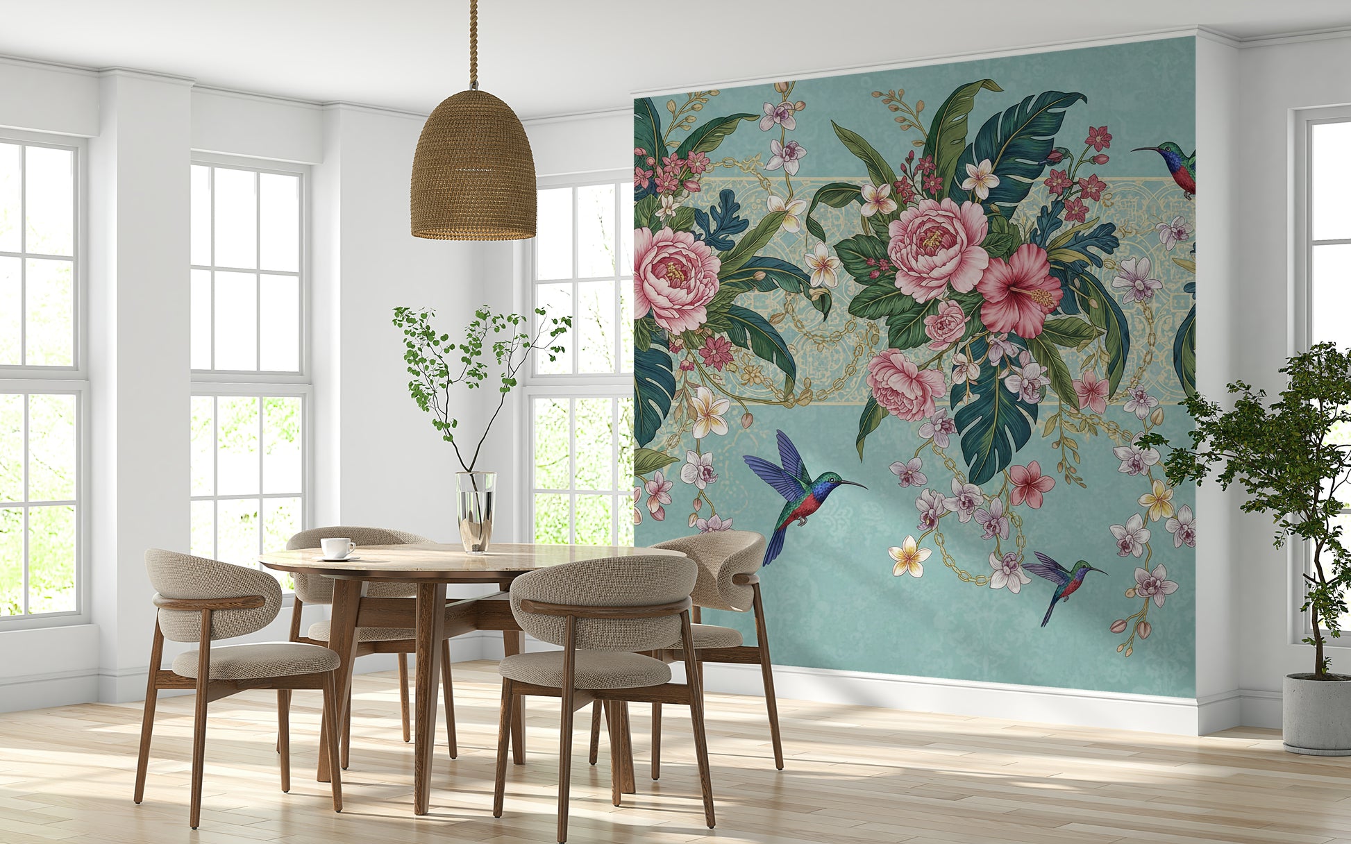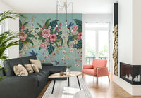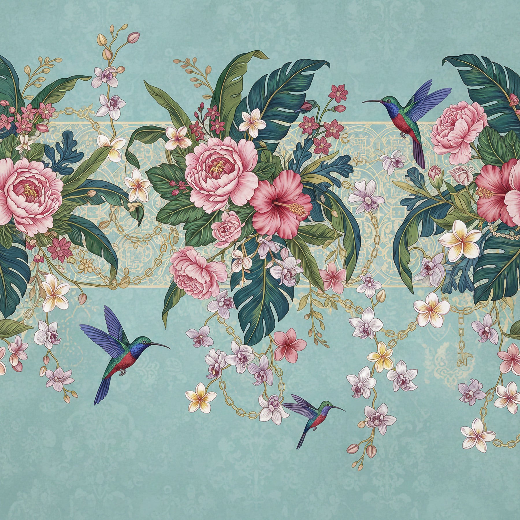 Bring a touch of the tropics to your home with this enchanting wallpaper for walls. Lush pink peonies and hibiscus mingle with vibrant green palm leaves and delicate orchids, creating a vibrant garden oasis. Hummingbirds add a splash of color and whimsy. A subtle, textured aqua background with a hint of vintage damask pattern provides a sophisticated backdrop. Gold chain details add a touch of luxury. This design works beautifully in living rooms, bedrooms, or dining rooms, infusing spaces with a sense of serenity and natural beauty.