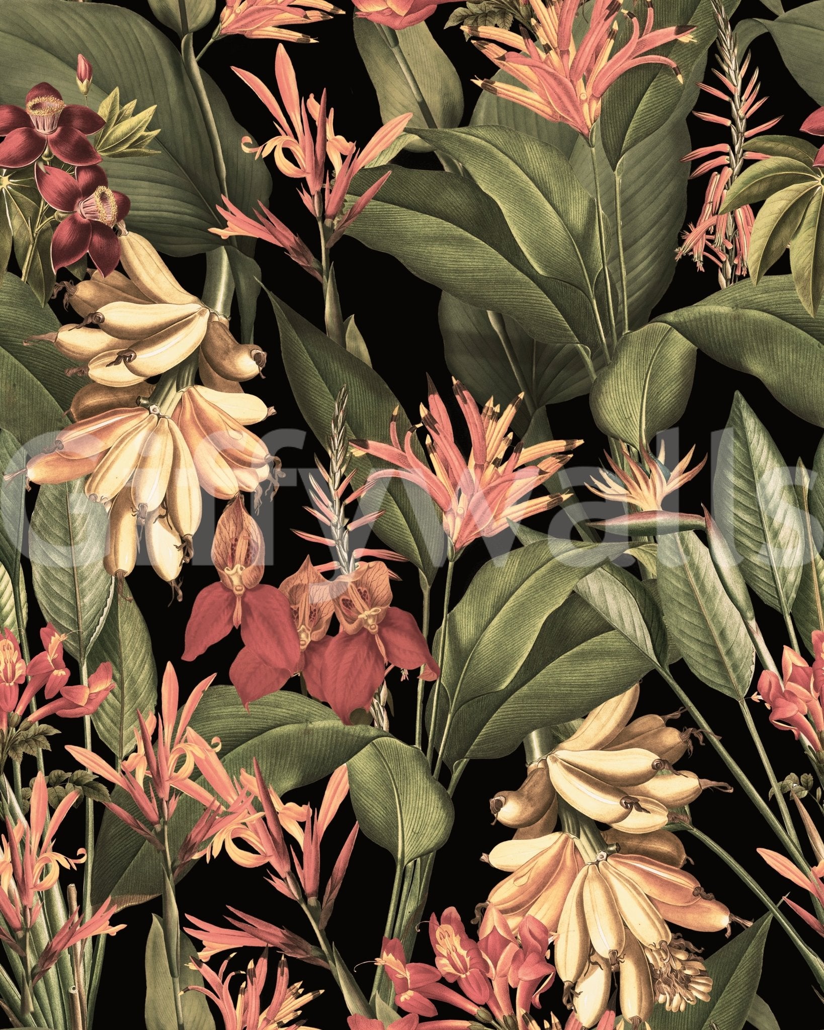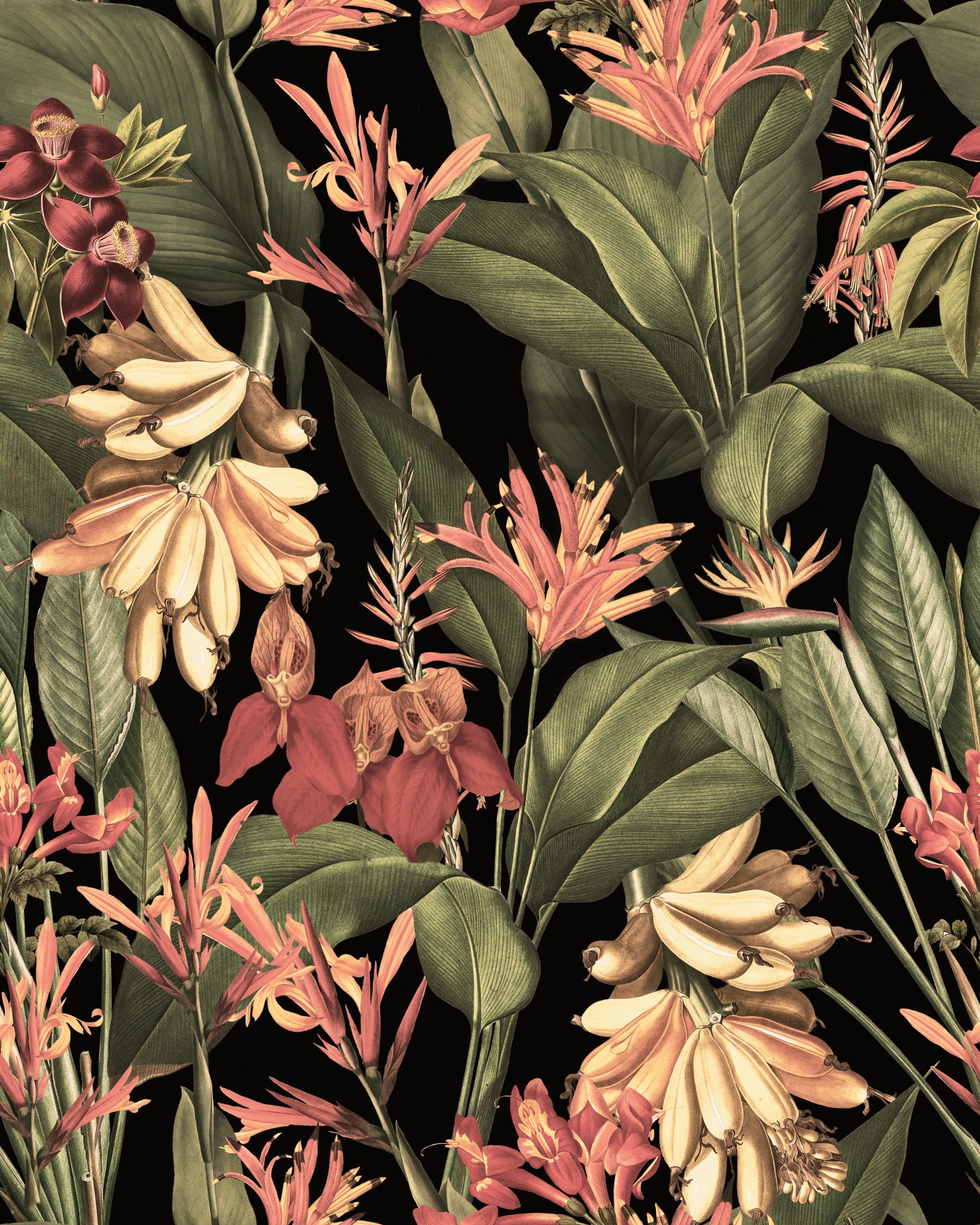 Immerse yourself in the lush beauty of 'Tropical Nights,' a wallpaper design that evokes the vibrant energy of a moonlit jungle. Rich, earthy greens and muted reds and oranges dominate the scene, creating a sophisticated yet warm ambiance. Intricate botanical illustrations of banana bunches, exotic flowers, and broad leaves are masterfully rendered, offering a detailed and captivating visual experience. The dark background enhances the luminosity of the flora, making this wallpaper a striking addition to any space seeking a touch of sophisticated tropical elegance.