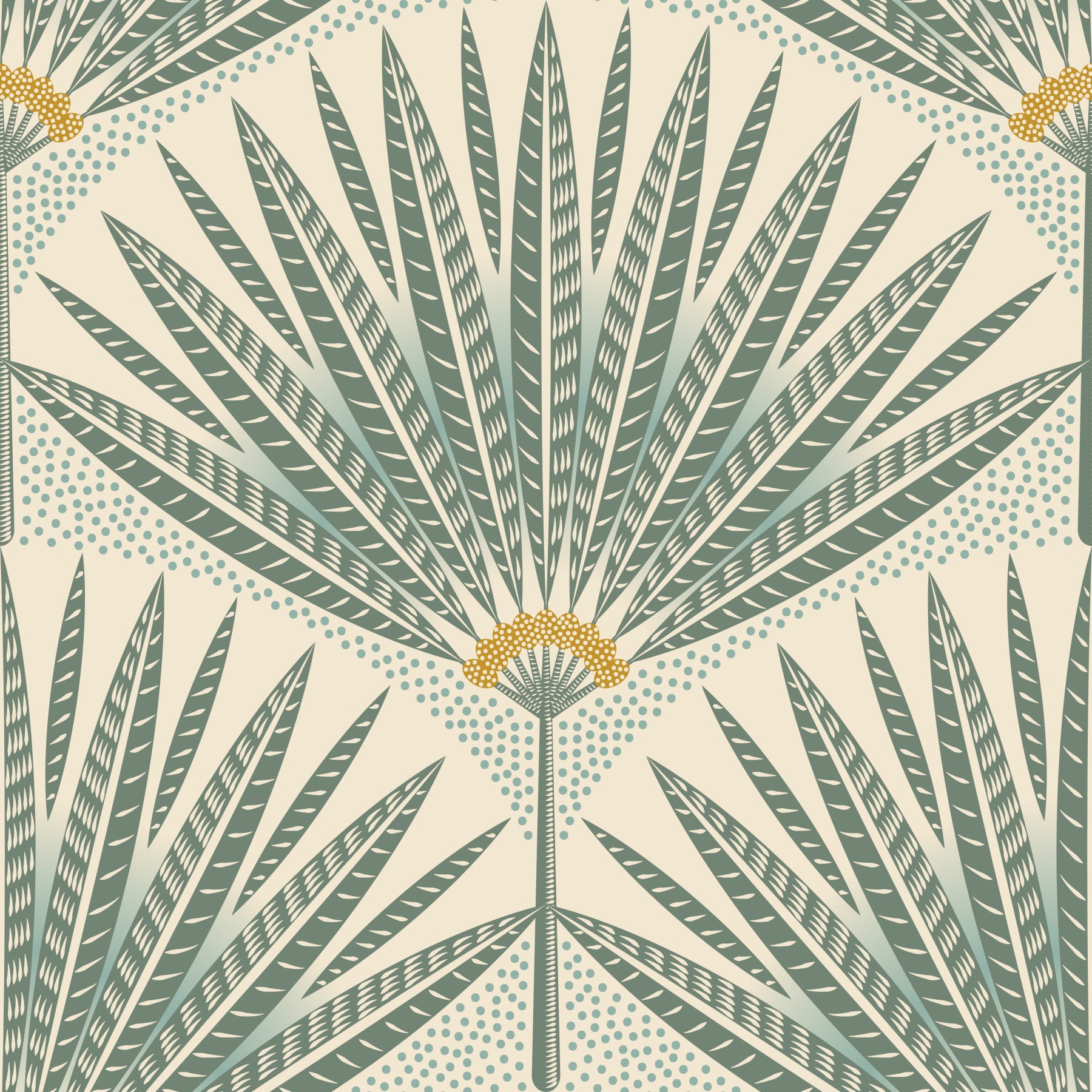 Escape to a tranquil tropical paradise with this wallpaper featuring a lush, stylized palm leaf pattern. The soft, muted color palette of sage greens and creams evokes a sense of peace and relaxation. The carefully balanced design creates a seamless and visually appealing pattern that effortlessly enhances any room. Whether used in a bedroom, living room, or home office, this wallpaper brings a touch of the tropics to your home, transforming your space into a calming sanctuary.