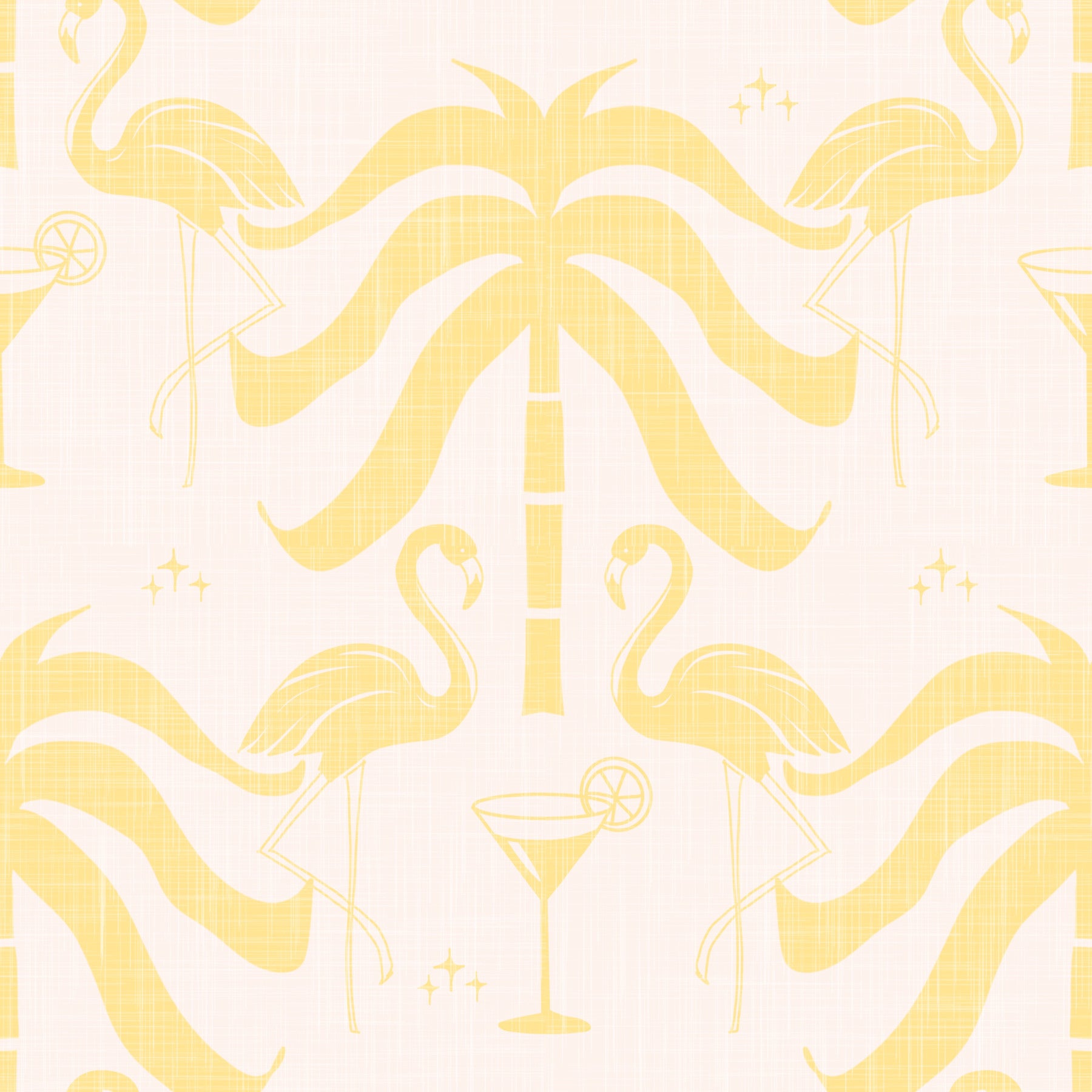 Escape to a sun-drenched paradise with our Tropical Palm Springs Flamingo Beige Butter Yellow wallpaper. This design evokes the laid-back glamour of Palm Springs, blending vintage charm with tropical allure. Delicate butter yellow silhouettes of elegant flamingos, swaying palm trees, and sophisticated cocktails dance against a subtle beige backdrop, creating a serene yet stylish ambiance. Tiny starbursts add a touch of whimsical sparkle. The texture of the wallpaper has a slight linen feel, which adds warmth and a tactile dimension to the design. Infuse your space with a touch of retro chic, reminiscent of leisurely poolside days and balmy desert evenings. Perfect for creating a relaxing bedroom retreat, a playful living room accent wall, or a cheerful dining area, this wallpaper brings a refreshing dose of sunshine and sophistication to any interior.