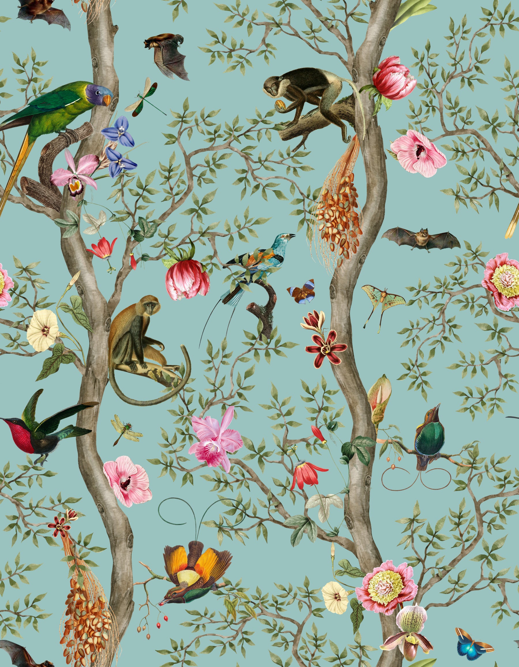 Escape to a 'Tropical Paradise Birds' with this vibrant wallpaper. The design showcases a stunning array of exotic birds perched amongst lush foliage and vibrant flowers. From hummingbirds to parrots, each bird is depicted with exquisite detail, creating a captivating scene of tropical life. The calming teal background complements the bold colours of the flora and fauna, lending an air of tranquility to the lively composition. Perfect for adding a touch of exotic beauty and elegance to any space, this wallpaper evokes feelings of warmth, relaxation, and escape.