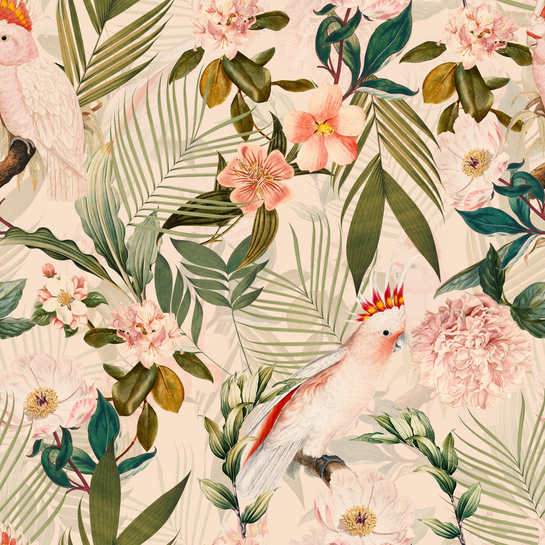Immerse yourself in a vibrant tropical paradise with this exquisite wallpaper. Intricate watercolor illustrations of pink and white cockatoos perch amidst a lush landscape of exotic blooms. Delicate pink peonies, vibrant hibiscus, and lush palm leaves create a harmonious blend of color and texture. The soft beige background enhances the overall serene and romantic atmosphere, making it perfect for adding a touch of elegant nature to any room. This wallpaper evokes a feeling of calm and tranquility, transporting you to a tranquil oasis.