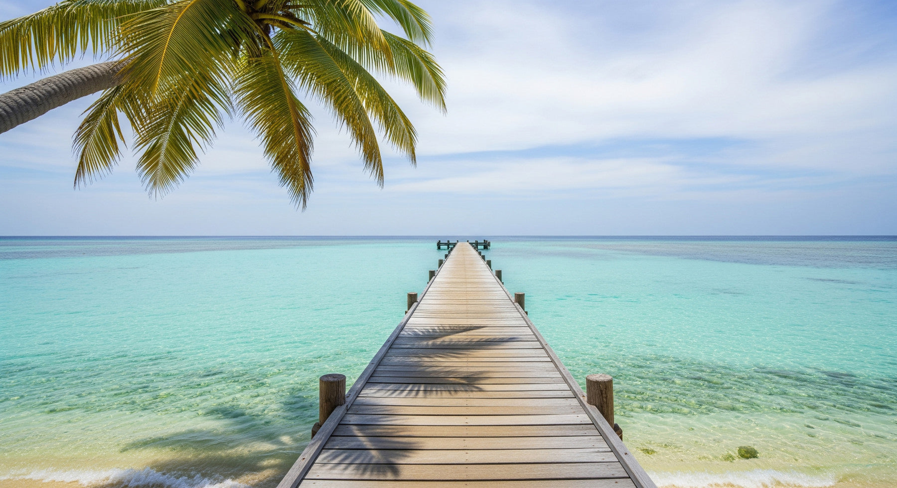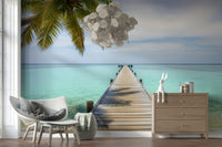 Escape to paradise with 'Tropical Pier', a breathtaking vista ideal for transforming any room into a tranquil retreat. Imagine yourself strolling along a weathered wooden pier, its planks warmed by the sun, stretching out into an endless expanse of turquoise water. A majestic palm tree, its fronds swaying gently in the breeze, frames the scene, casting intricate shadows that dance across the sun-kissed wood. The crystal-clear sea reveals the sandy bottom below, creating a sense of serene depth and inviting calm. This scene evokes the feeling of warm breezes and the gentle lapping of waves, adding a touch of vacation bliss to your everyday living space, an ideal choice for creating a peaceful and relaxing atmosphere.