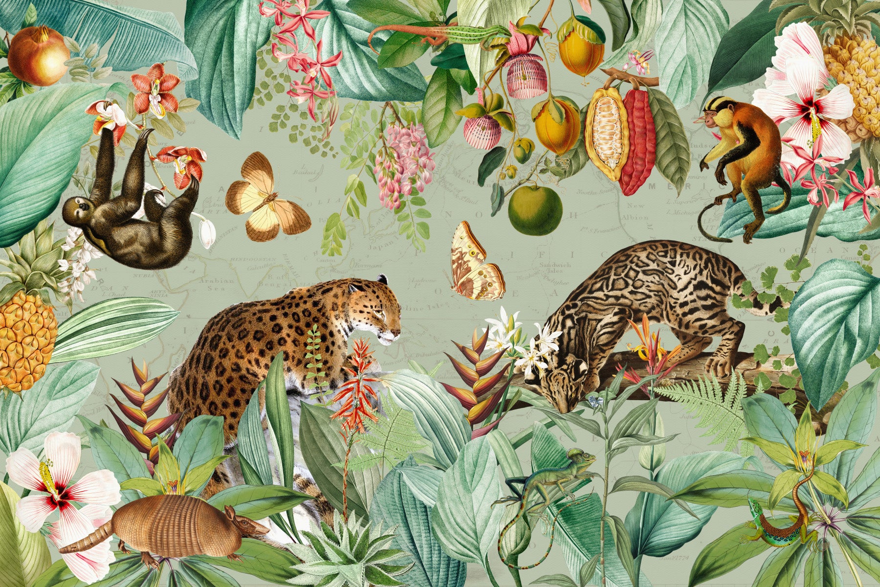Embark on a captivating visual journey with "Tropical Vintage Expedition." This stunning wallpaper transports you to a lush, vibrant rainforest, rendered in a classic vintage style. Intricate botanical illustrations of exotic flowers, fruits like cocoa pods and pineapples, and a vintage map backdrop create an atmosphere of scientific exploration and discovery. Magnificent wildlife, including jaguars, sloths, monkeys, and armadillos, are seamlessly integrated into this detailed composition, offering a unique and enchanting blend of nature's beauty and the allure of past expeditions. The rich color palette and meticulous detail evoke a sense of wonder and adventure, perfect for adding a touch of exotic elegance to any space.