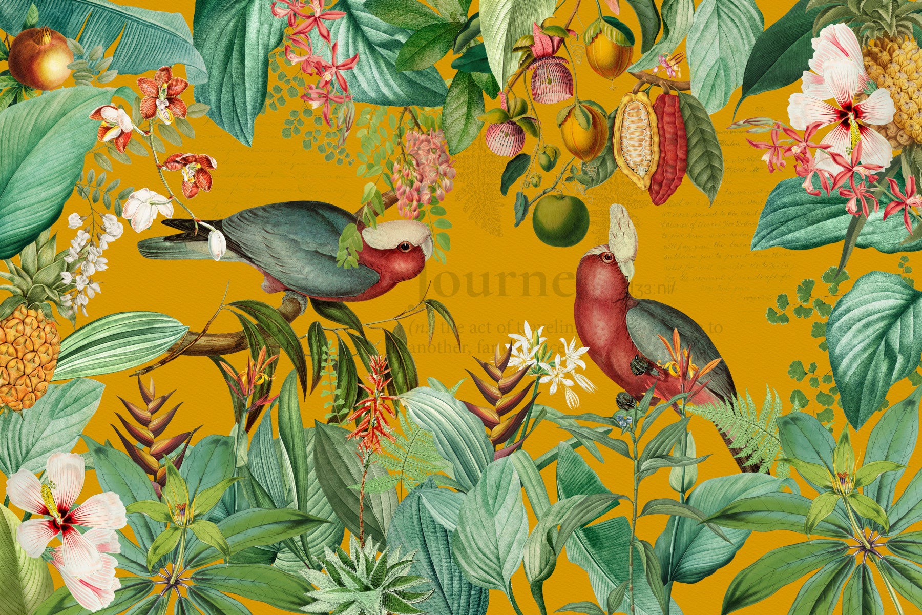 Embark on a vibrant visual journey with this tropical wallpaper. Rich botanical illustrations of exotic birds, lush foliage, and vibrant flowers create a sense of adventure and escapism. The mustard yellow background adds a warm, inviting touch, complemented by the deep greens and reds of the flora and the striking plumage of the birds. This wallpaper is perfect for adding a touch of exotic beauty to any room, transporting you to a faraway paradise with its detailed, hand-drawn style. It evokes a feeling of exploration and wonder, making it a striking and memorable addition to your home decor.