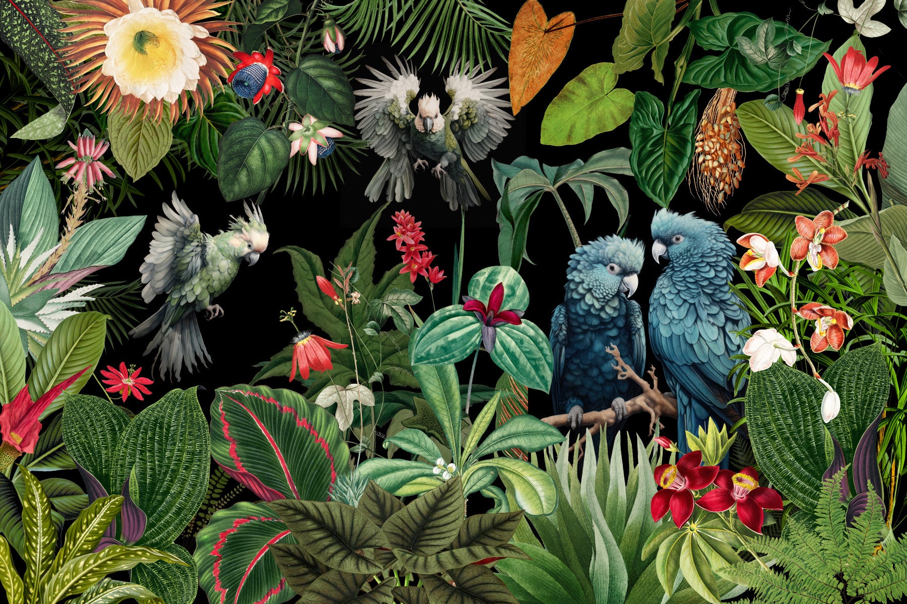 Immerse yourself in a vibrant tapestry of tropical flora and fauna with this captivating wallpaper. Intricate botanical illustrations of lush green leaves, exotic red and pink flowers, and brilliantly colored parrots create a visually stunning scene. The dark background enhances the rich details of each element, giving the wallpaper an almost museum-like quality. This piece is perfect for adding a touch of exotic elegance and sophistication to any room, bringing a sense of calm yet vibrant energy to your space. The intricate details and vibrant colors make this wallpaper an ideal statement piece.