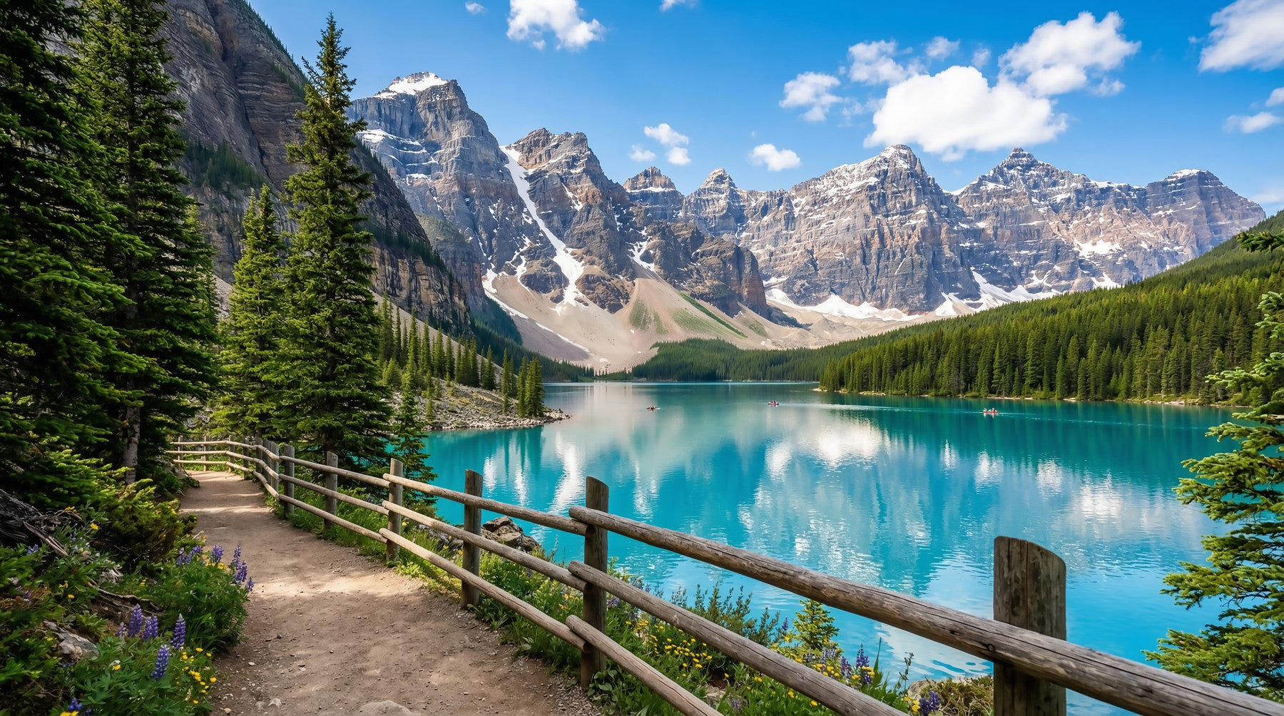 This breathtaking landscape wallpaper for walls captures the majestic beauty of an alpine paradise. A brilliant turquoise lake reflects towering snow-capped mountains under a clear blue sky. Lush green pine forests flank the serene waters, creating a striking contrast. A rustic wooden fence guides the eye along a winding dirt path adorned with wildflowers, inviting viewers into the scene. This design brings the grandeur of nature into any space, fostering a sense of peace and expansive beauty. Its vibrant blues, verdant greens, and earthy browns infuse vitality. Install this stunning feature in a living room, bedroom, home office, or hallway to create an unforgettable focal point and inspire daily serenity.