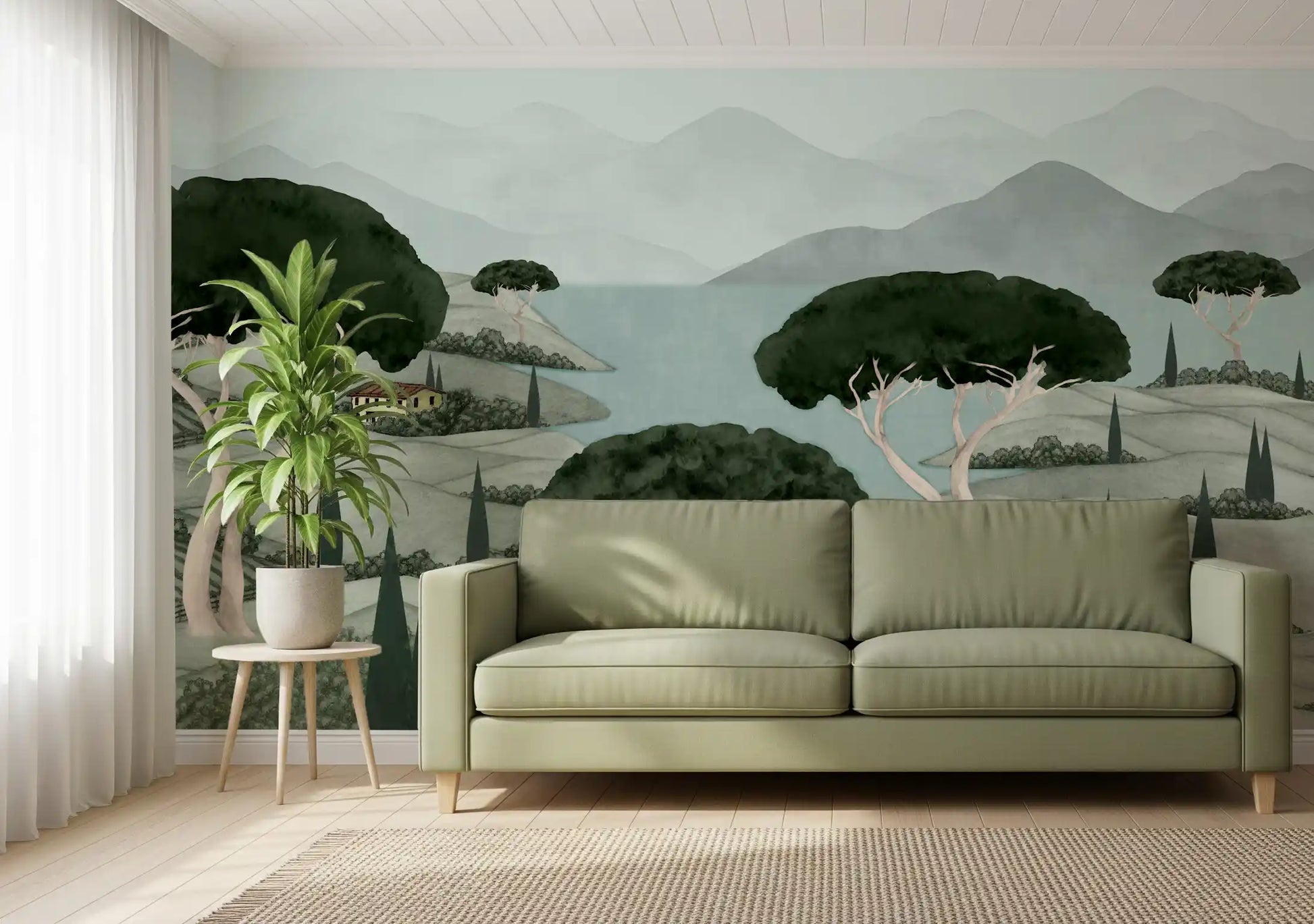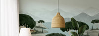 Transform your living space with this enchanting wallpaper for walls, depicting a serene Tuscan dreamscape. Gentle rolling hills, characteristic Italian cypress trees, and majestic umbrella pines define the landscape. A tranquil body of water meanders through the scene, reflecting soft blue and green hues under distant, misty mountains. The muted color palette features sophisticated sage greens, creamy off-whites, and serene teals, with a subtle pop of warm terracotta on the charming villa roof. This illustrative design creates a peaceful atmosphere, perfect for a living room, bedroom, or dining area. It offers a calm, sophisticated backdrop, enhancing any room with its elegant, nature-inspired beauty.