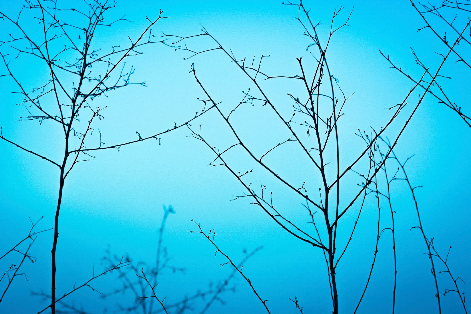 Capture the serene stillness of 'Twilight in the Outdoors' with this evocative wallpaper. Silhouetted branches reach skyward against a gradient of cool, calming blues, reminiscent of the fading light just after sunset. The minimalist composition evokes a sense of quiet contemplation, inviting you to pause and appreciate the subtle beauty of nature's transition from day to night. This wallpaper offers a peaceful aesthetic, ideal for creating a relaxing and uncluttered digital environment. Let the understated elegance of nature's twilight transform your screen into a serene escape.