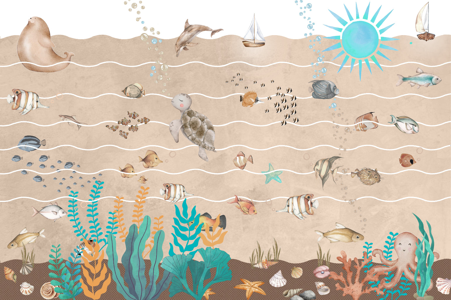 Our Underwater Sea Life Wallpaper Mural turns any room into an aquatic adventure. This playful design showcases a vibrant underwater world filled with cheerful sea creatures, from curious turtles and dolphins to colorful fish and friendly octopuses. The soft, earthy tones blend seamlessly with bright marine hues, making it a perfect choice for nurseries, playrooms, or creative spaces. Crafted from high-quality materials, this underwater mural adds a lively, oceanic vibe while offering durability and easy maintenance. Dive into a whimsical underwater scene that sparks your imagination and brings the beauty of the sea to your walls.