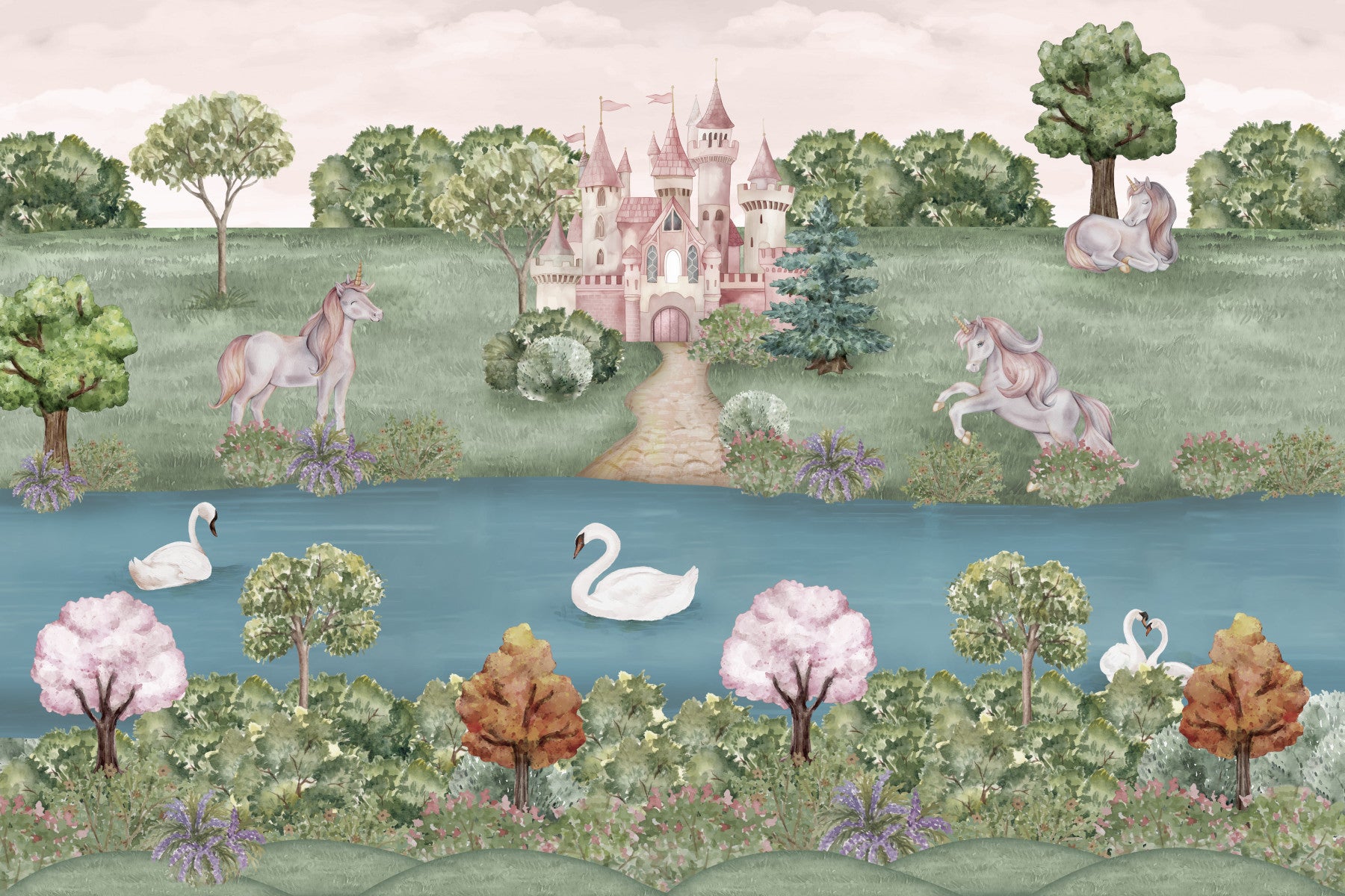 Transform a space into a storybook scene. This enchanting design features unicorns, a whimsical castle, and graceful swans on a serene lake. The soft pastel colors create a peaceful vibe, ideal for a nursery or girl's bedroom. The hand-painted style adds a touch of charm. Consider this wallpaper for walls to bring a fairytale atmosphere to a playroom or bedroom. The design's gentle colors and dreamy subjects complement interiors seeking a touch of fantasy.