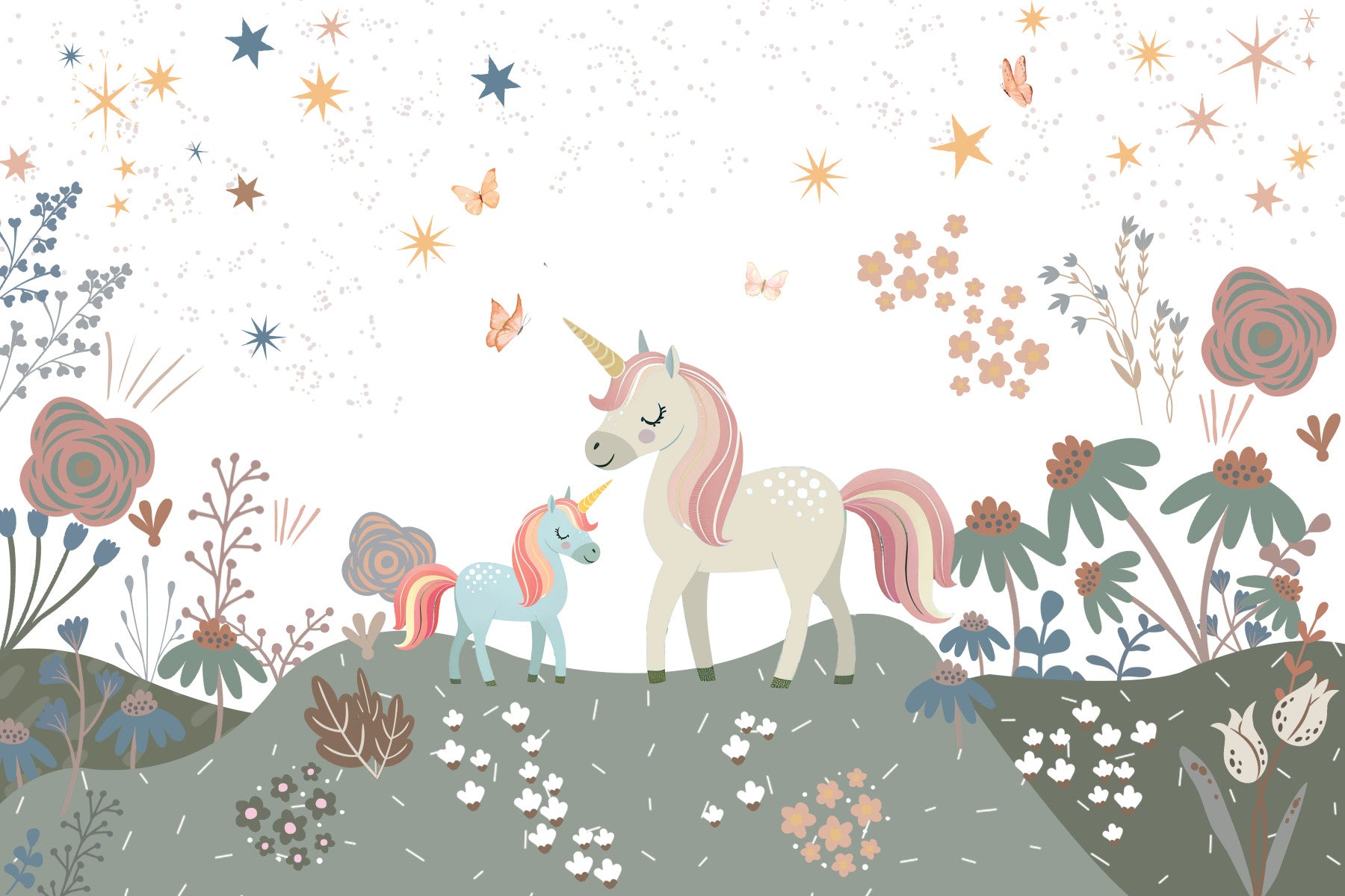 Enchant a kid's space with this charming wallpaper for walls! Two unicorns grace a whimsical landscape filled with stylized flowers, stars, and butterflies. The pastel color scheme, featuring soft blues, pinks, and earthy greens, creates a calming, magical scene. This design complements interiors in nurseries, playrooms, or bedrooms, bringing a touch of fantasy to any space. It encourages imagination and makes rooms feel cozy.