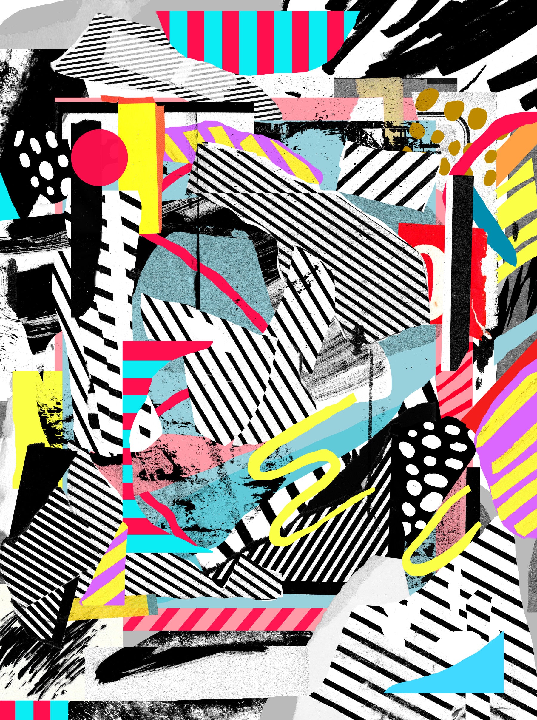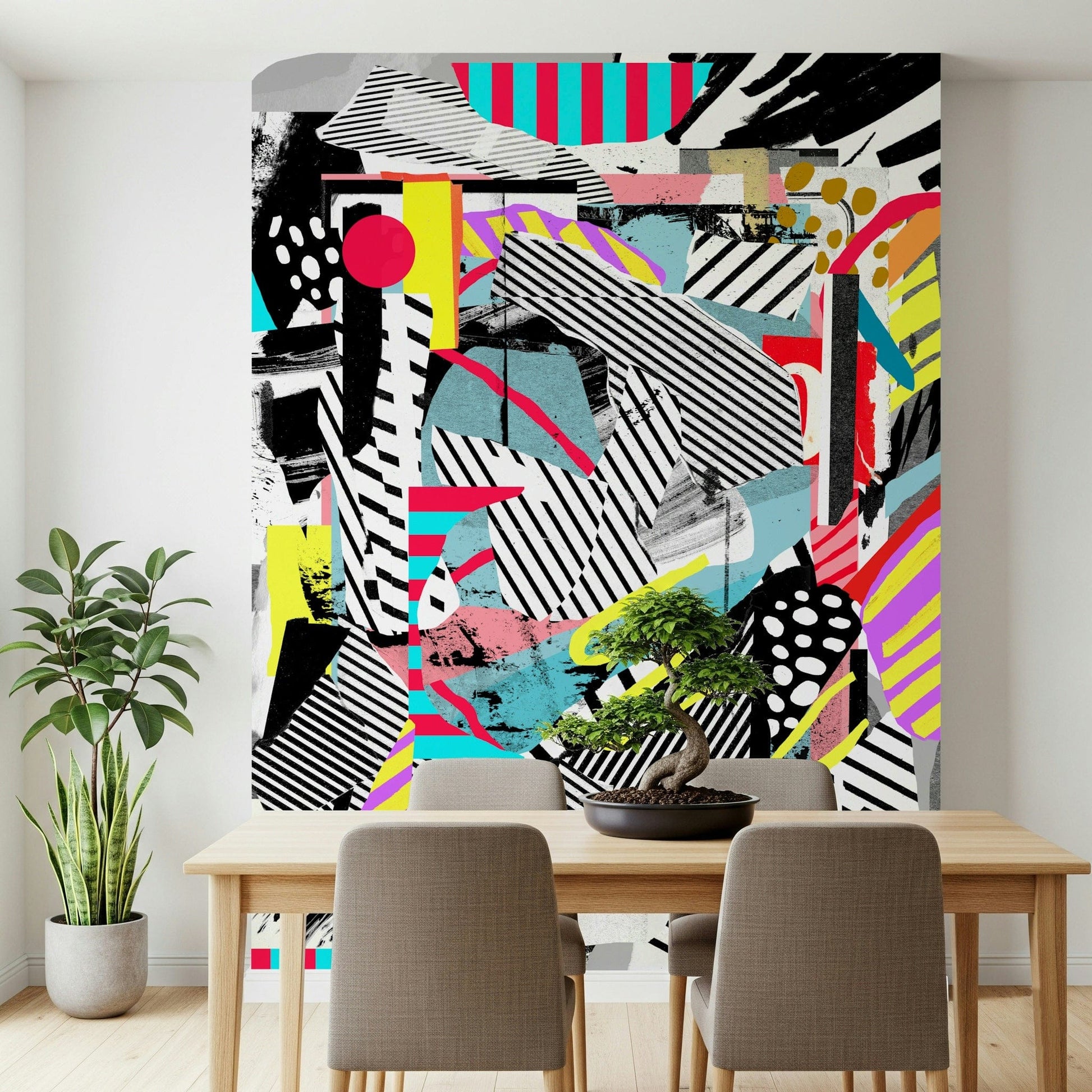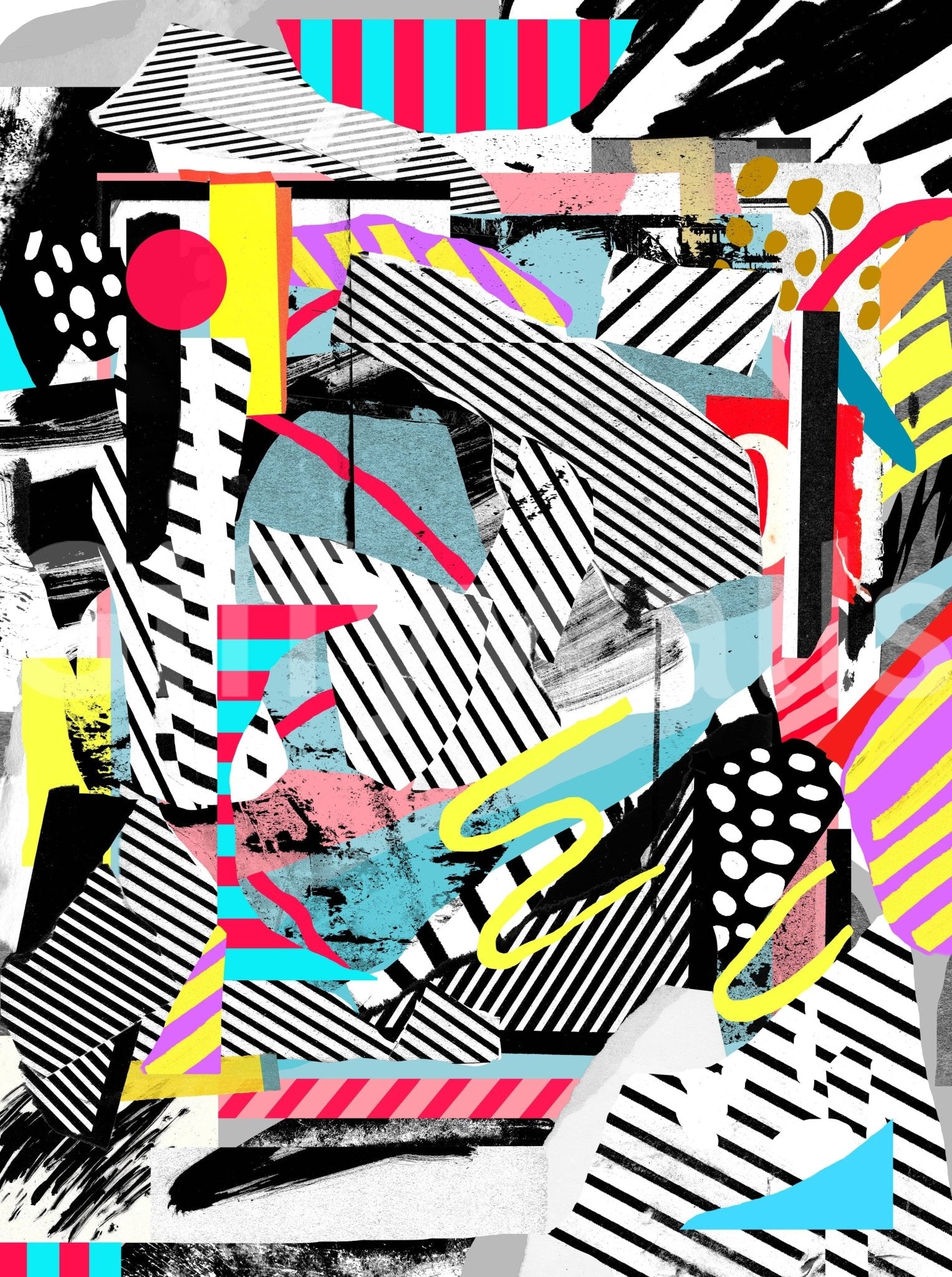 Transform your space with this striking abstract design. It is characterized by a layered collage effect. This artistic wallpaper showcases bold lines, geometric forms, and brushy textures in a lively palette. The combination of black, white, turquoise, yellow, and pink hues creates an exciting statement. The design provides a contemporary feel for a living room, hallway, or creative studio. Think of this wallpaper for walls as it energizes the atmosphere. Consider pairing with minimalist furniture.