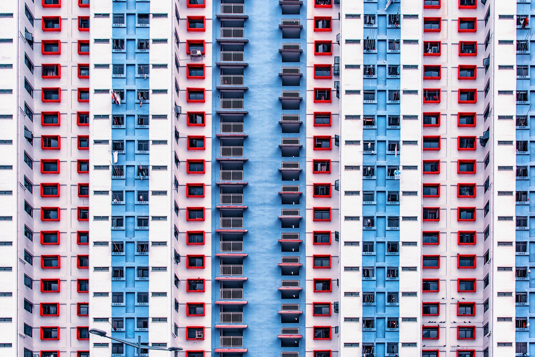 Transform any room with this modern architectural wallpaper for walls, which features repeating patterns of building facades. This wallpaper presents a rhythmic arrangement of windows and balconies, painted in vibrant blues, whites, and bold red accents. It adds a dynamic, urban feel to your living room, hallway, or office. The geometric design creates a structured, engaging look, enhancing the depth and visual interest of your interior. It works great as an accent wall, infusing space with contemporary style.