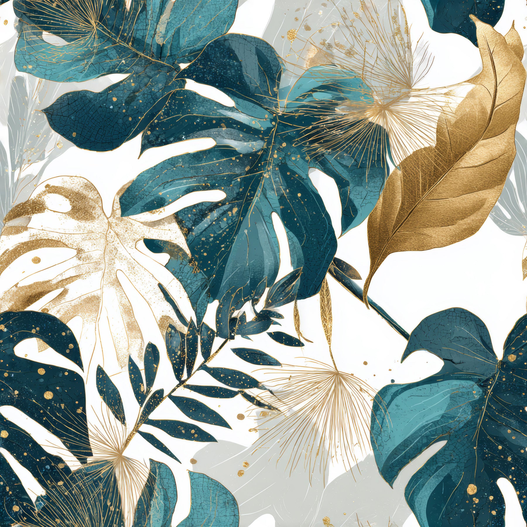 Escape to an "Urban Jungle Dream" with this sophisticated wallpaper. Deep teal and luxurious gold accents bring the wild indoors, showcasing stylized monstera leaves and delicate botanical details. The design blends natural forms with an opulent aesthetic, creating a refined yet vibrant atmosphere. Perfect for adding a touch of tropical elegance and modern flair to any space, this wallpaper transforms your walls into a tranquil oasis, reflecting a harmonious blend of nature and urban chic.