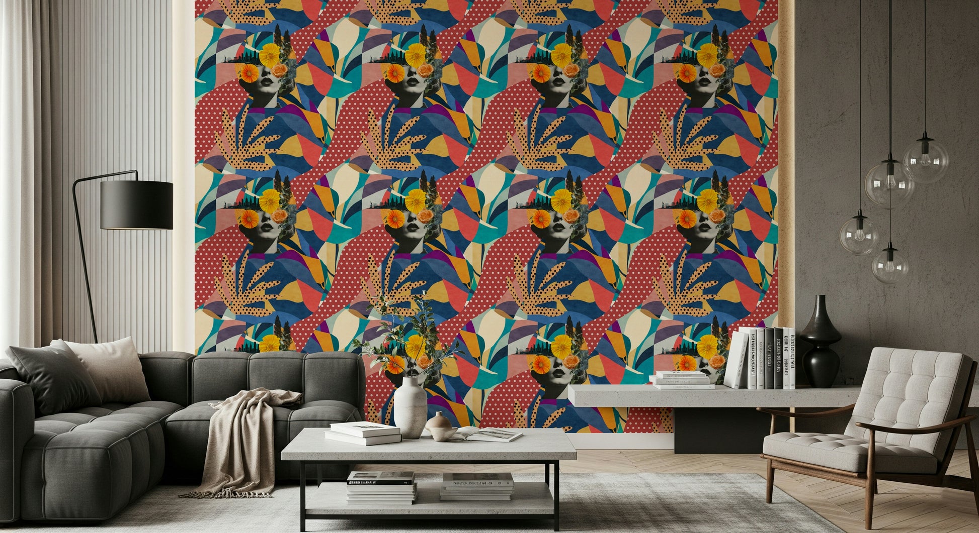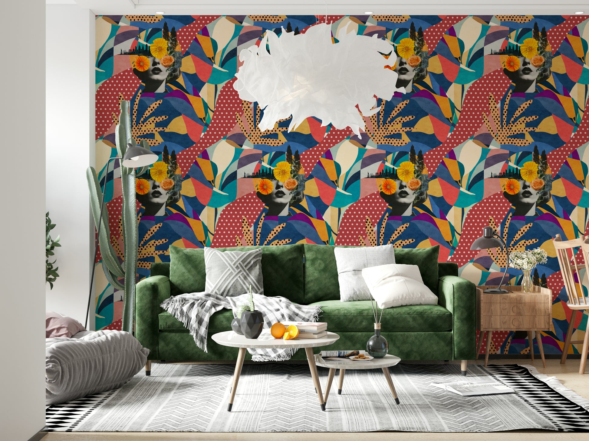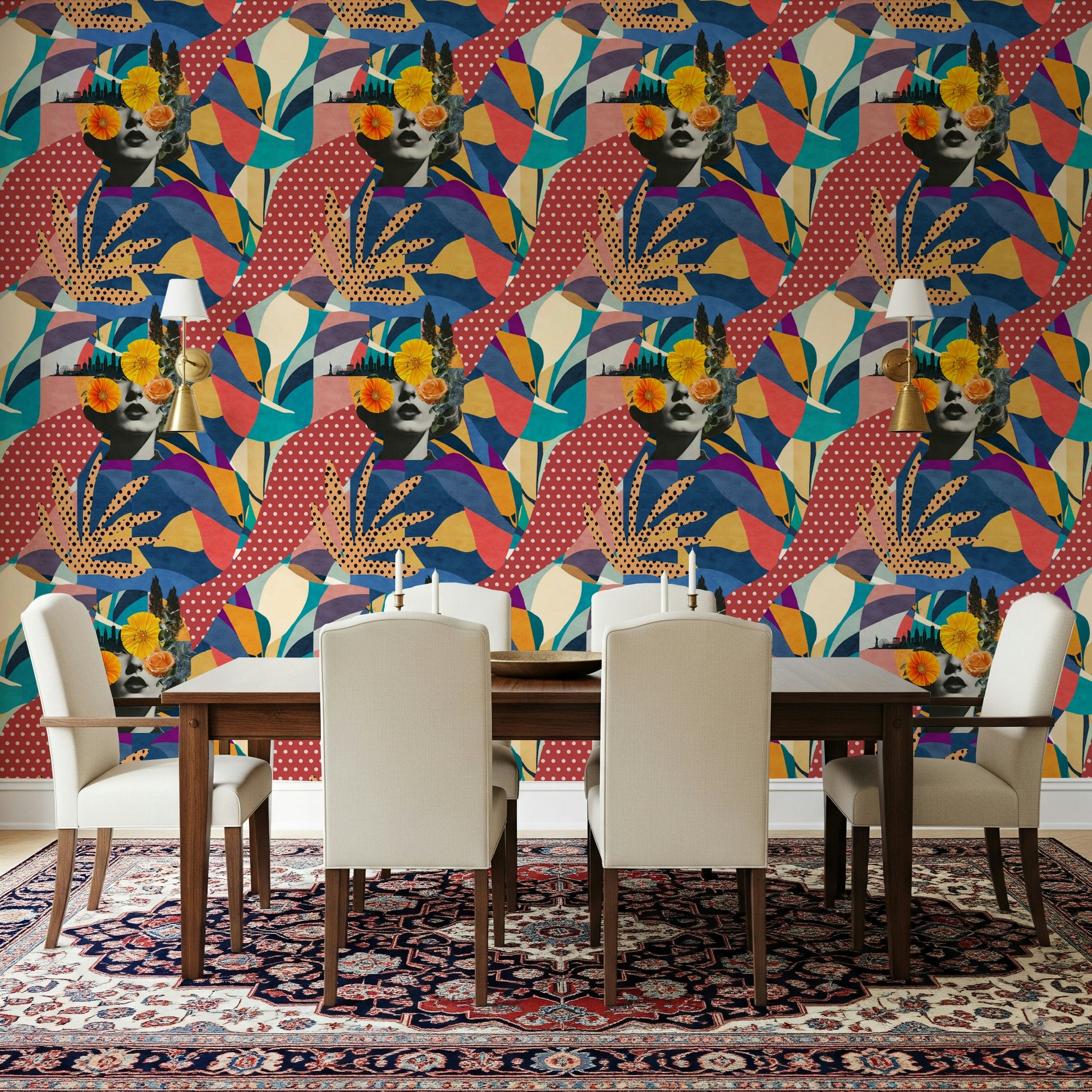 Immerse your space in the vibrant energy of "Urban Muse", a captivating collage that harmonizes the allure of city life with the delicate beauty of nature. This artistic statement showcases a vintage-inspired portrait overlaid with bold, abstract patterns in a rich palette of blues, reds, and yellows. The silhouette of a bustling cityscape, complete with iconic landmarks, subtly graces the backdrop, while delicate floral accents add a touch of organic charm. The result is a sophisticated yet playful design that breathes life into any room, lending it an air of mystery and modern elegance. The distinctive blend of geometric shapes and organic motifs makes this piece a conversation starter and a captivating focal point that will elevate the aesthetic of your personal haven.
