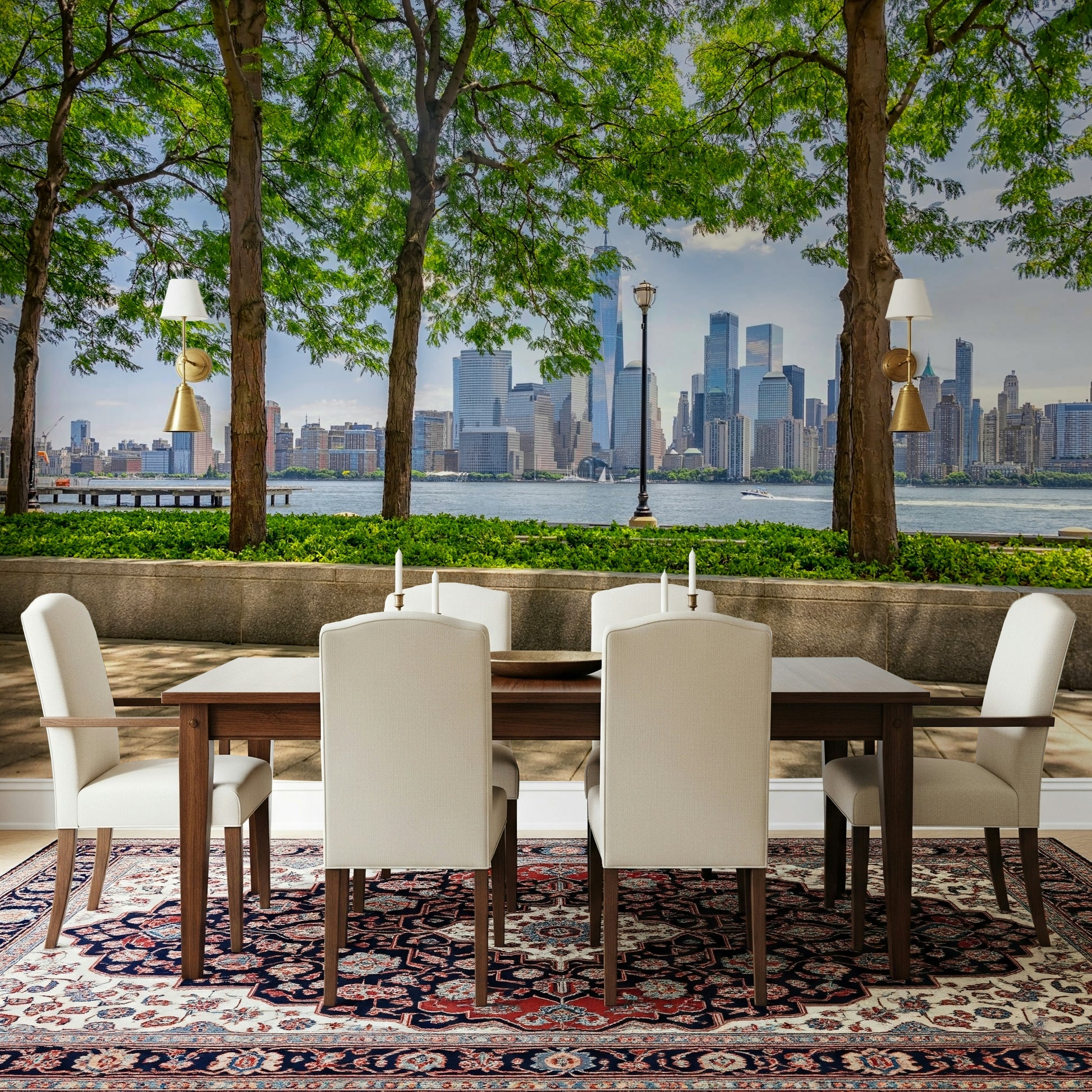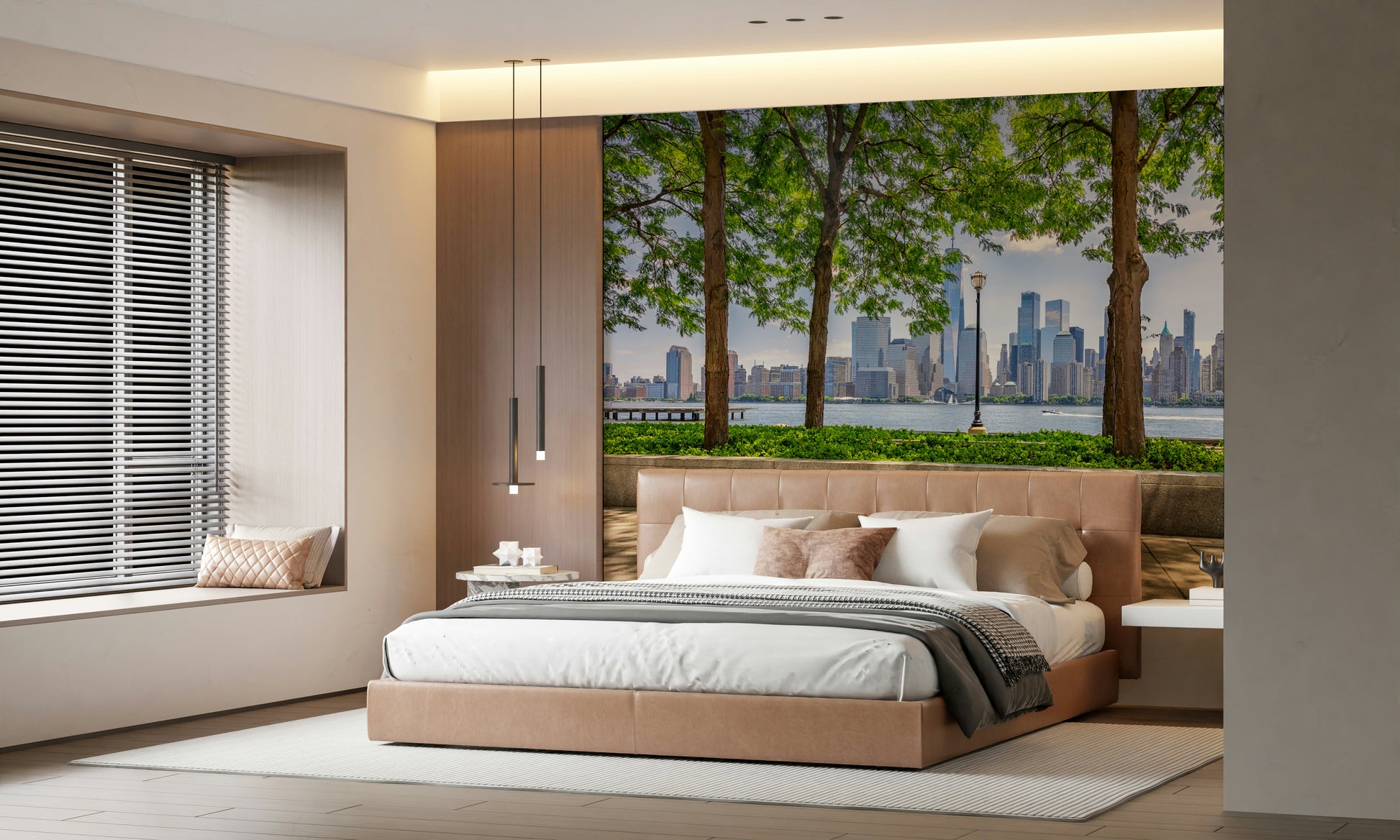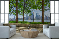 Bring a slice of serene cityscape into your home with this unique wallpaper for walls. It captures a view of the city skyline framed by lush greenery. The design presents a cool palette of greens, blues, and grays that fosters calm. It introduces a sense of nature within urban interiors. Picture this design brightening a modern living room or adding depth to a home office. The photograph suits a variety of spaces where you want to cultivate relaxation or add a nature-inspired scene.